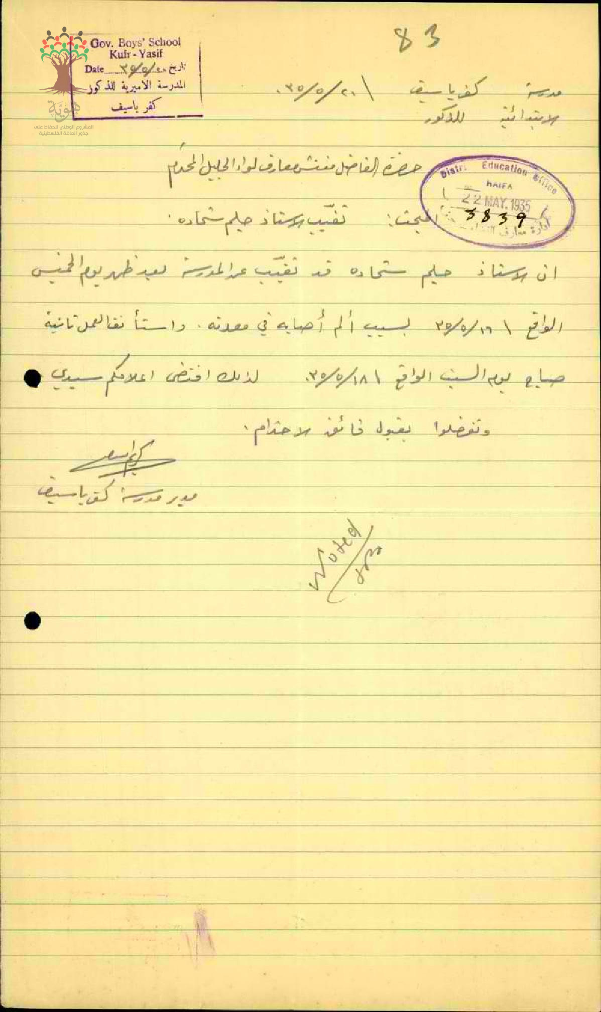 رسالة من مدير مدرسة كفر ياسيف الى مفتش المعارف بخصوص تغيب المعلم حليم شحادة