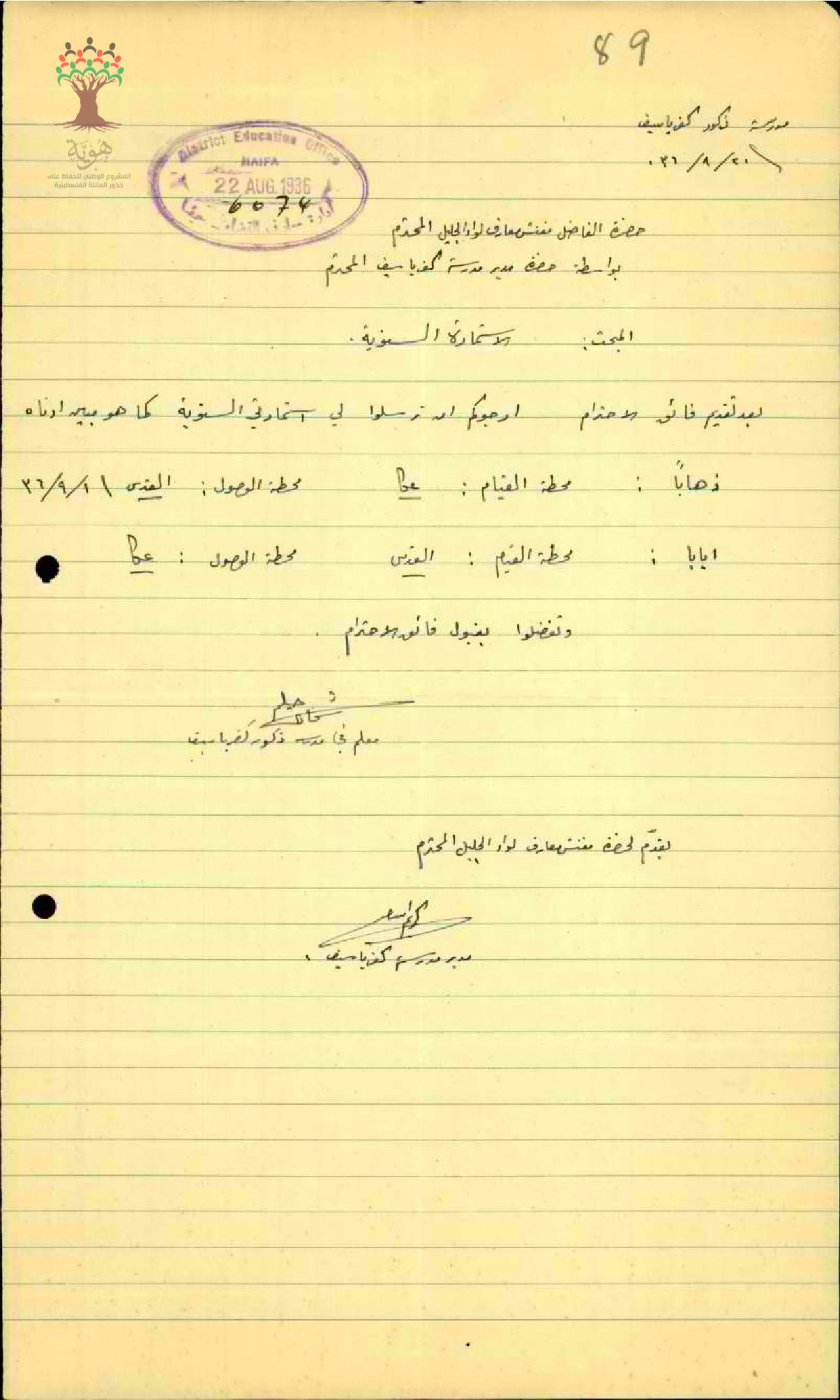 رسالة من المعلم حليم شحادة الى مفتش المعارف يطلب فيها استمارته السنوية