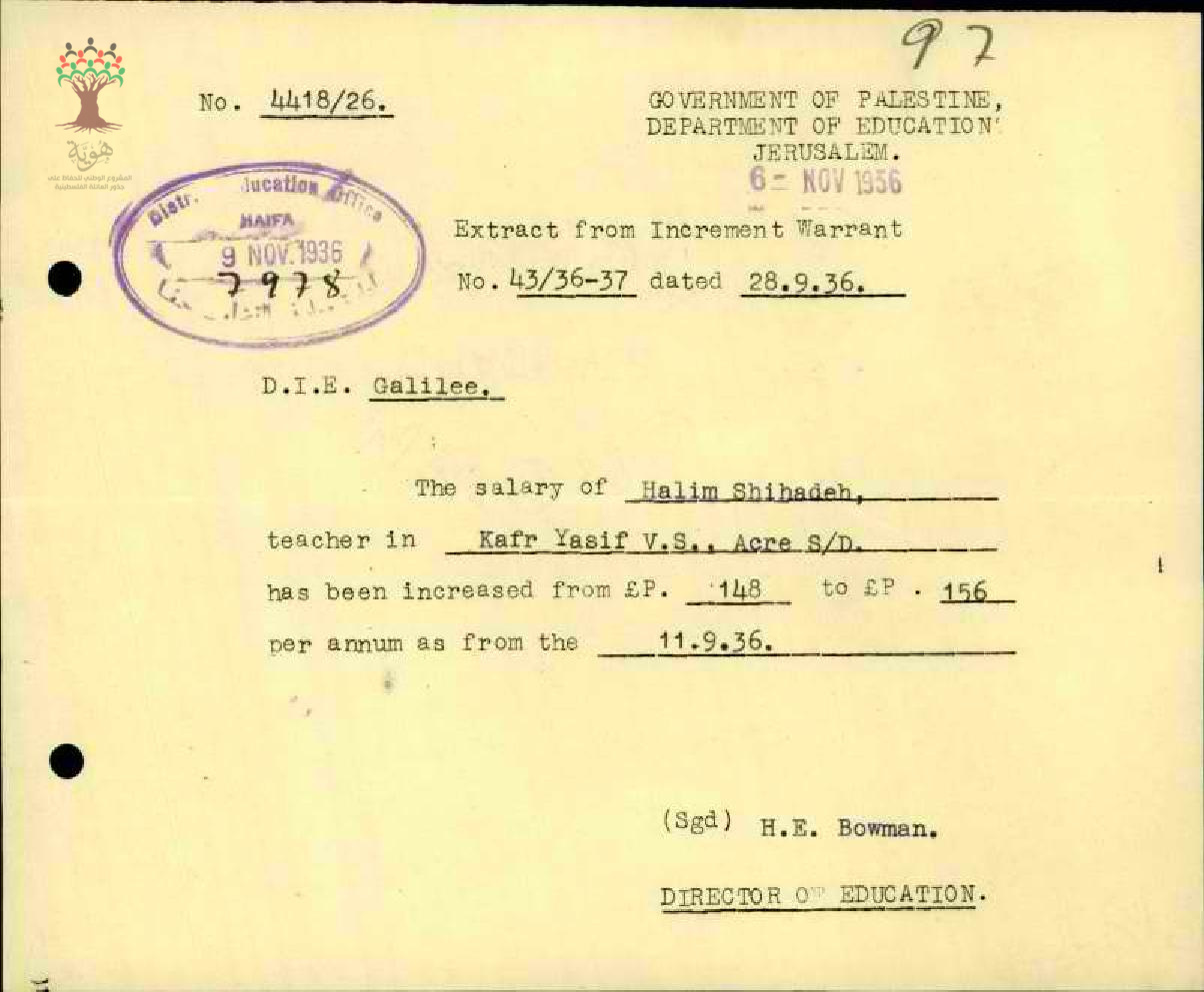 رسالة من مدير المعارف الى مفتش المعارف بخصوص زيادة راتب المعلم حليم شحادة