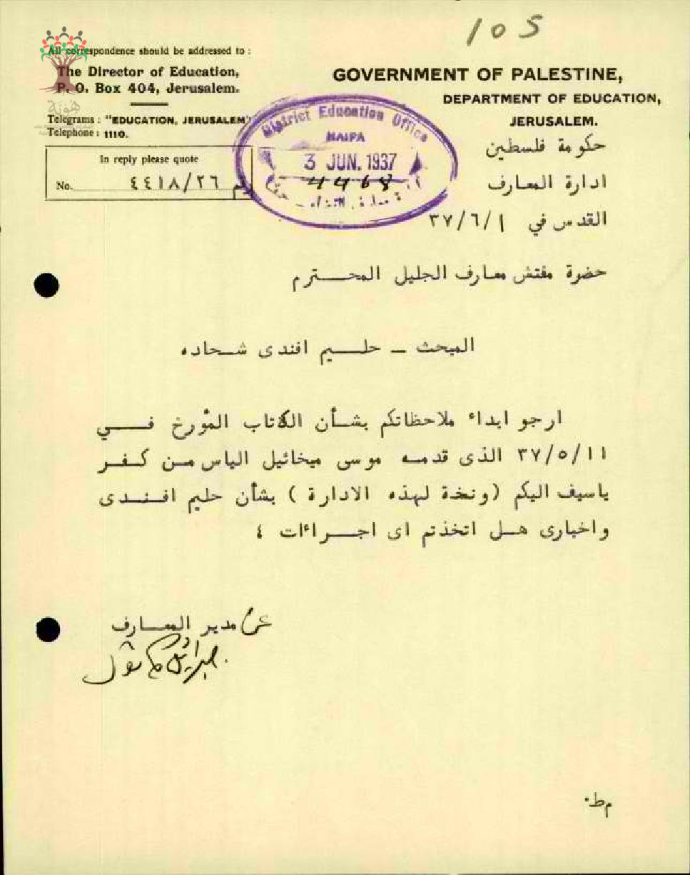 رسالة من مدير المعارف الى مفتش المعارف بخصوص الشكوى المقدمة ضد المعلم حليم شحادة