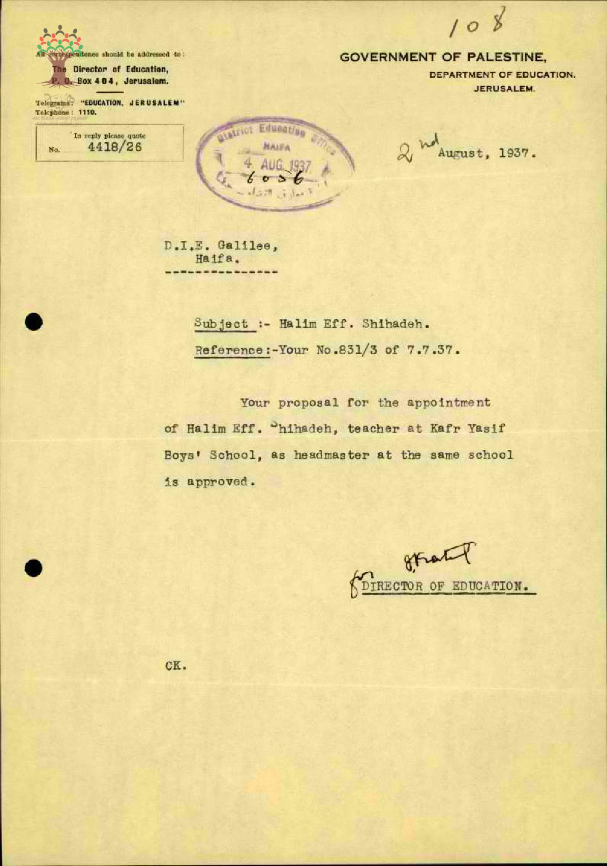 رسالة من مدير المعارف الى مفتش المعارف يوافق على اقتراحه في تعيين المعلم حليم شحادة مديرا لمدرسة كفر ياسيف