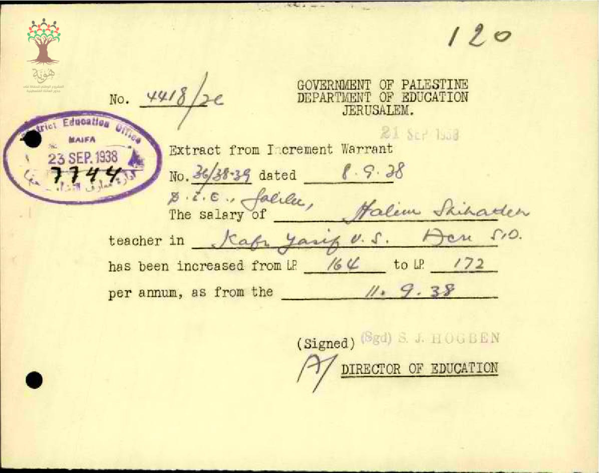 رسالة من مدير المعارف الى مفتش المعارف بخصوص زيادة راتب المعلم حليم شحادة