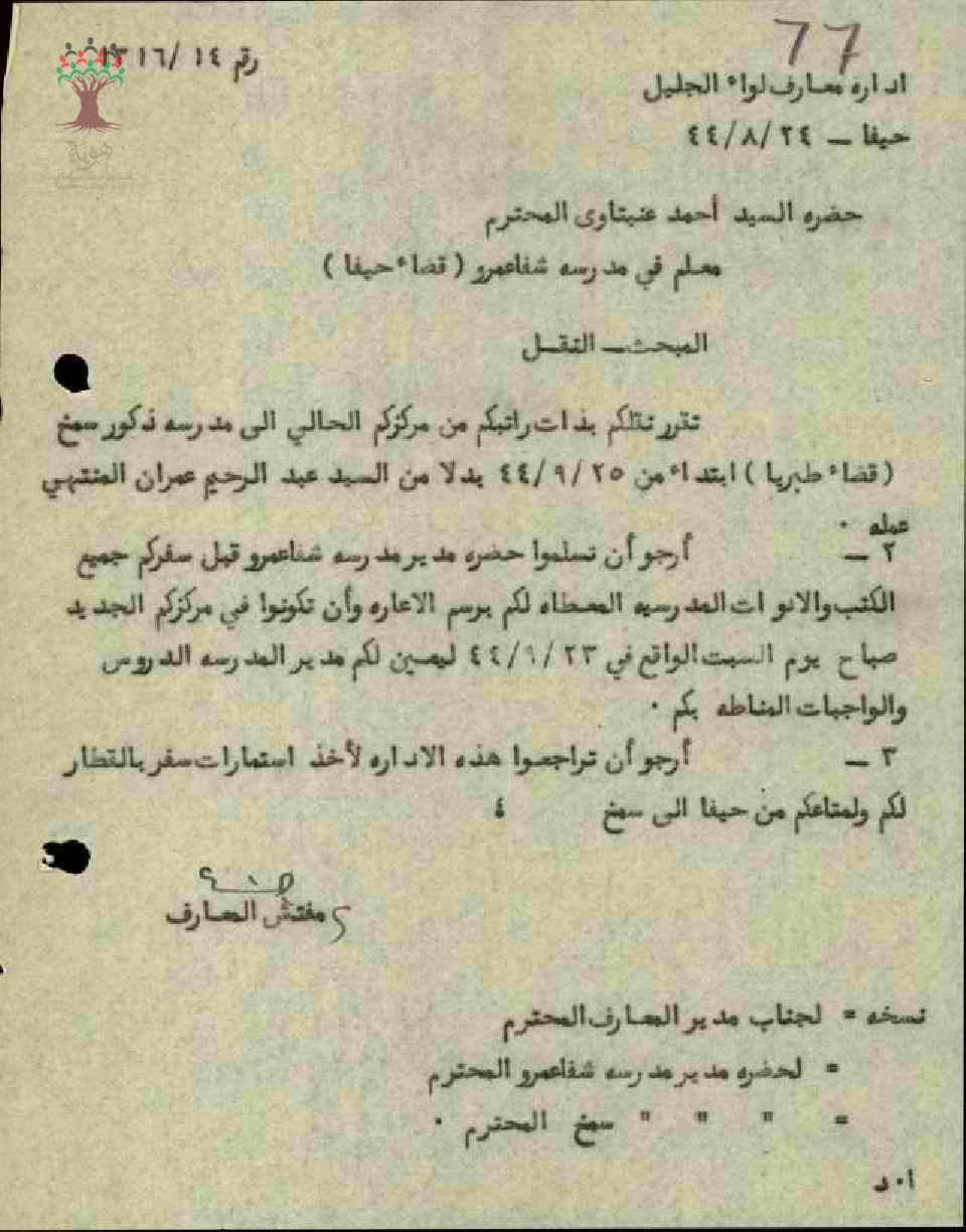 رسالة من مفتش المعارف إلى المعلم أحمد عنبتاوي يخبره بقرار نقله من مدرسة شفا عمرو إلى مدرسة سمخ (قضاء طبريا)