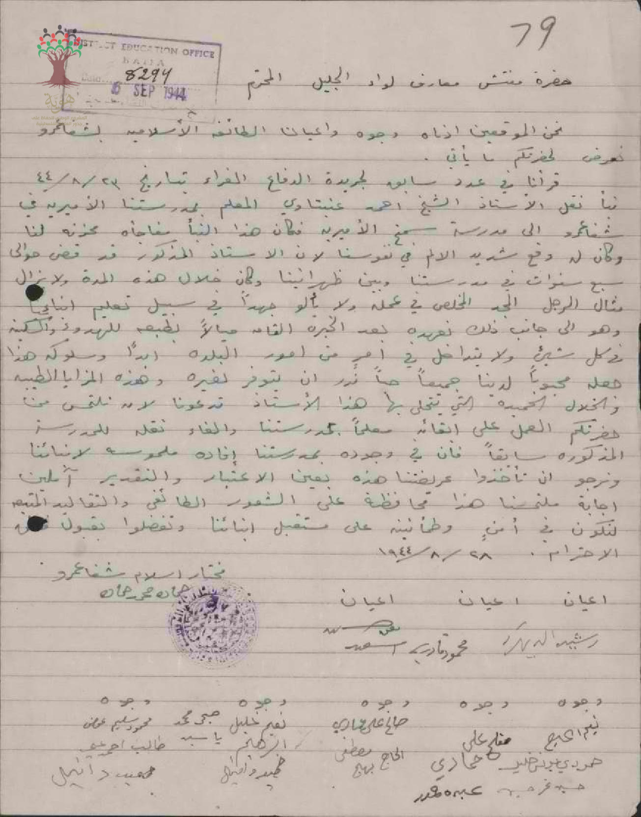 رسالة من مختار ووجوه وأعيان قرية شفا عمرو إلى مفتش المعارف تبحث أمر نقل المعلم أحمد عنبتاوي راجيين إعادة النظر في القرار
