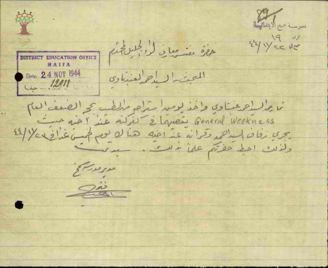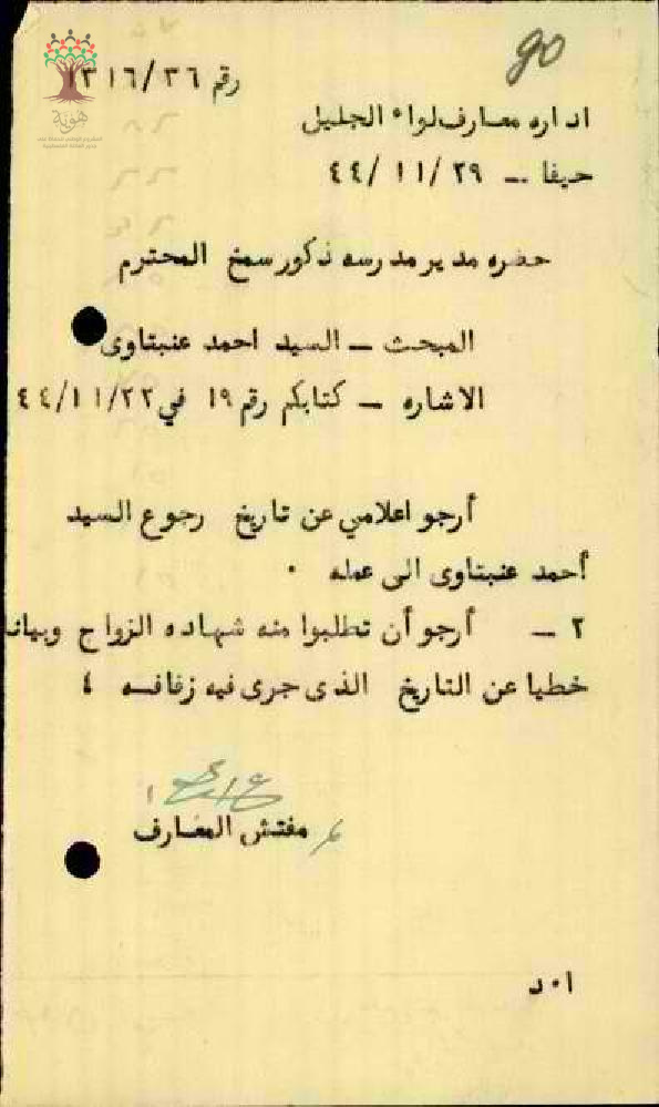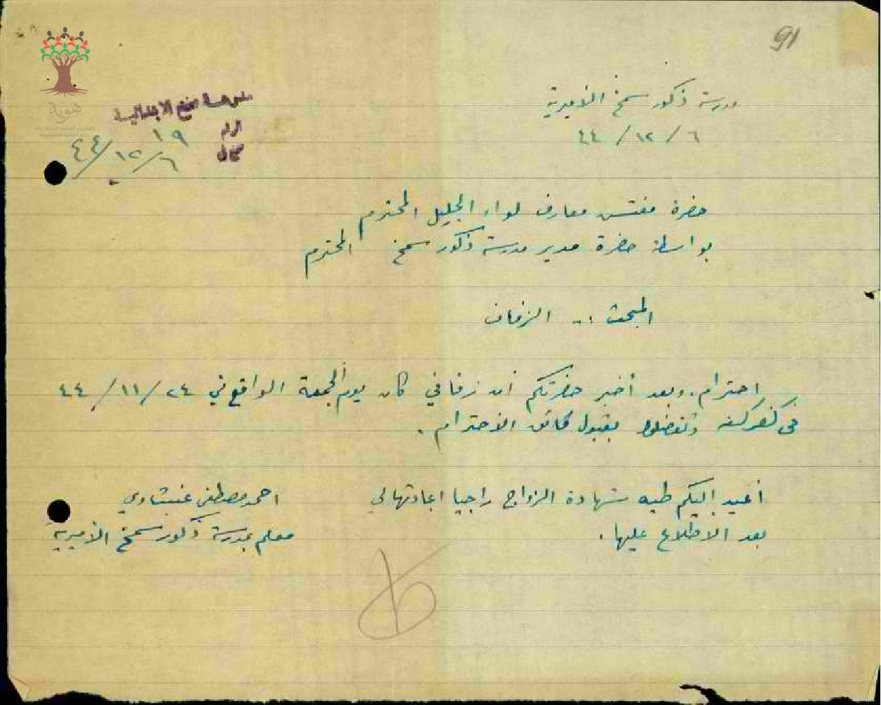 رسالة من مديير مدرسة سمخ إلى مفتش المعارف يخبره بغياب المعلم أحمد عنبتاوي بسبب عقد قرانه