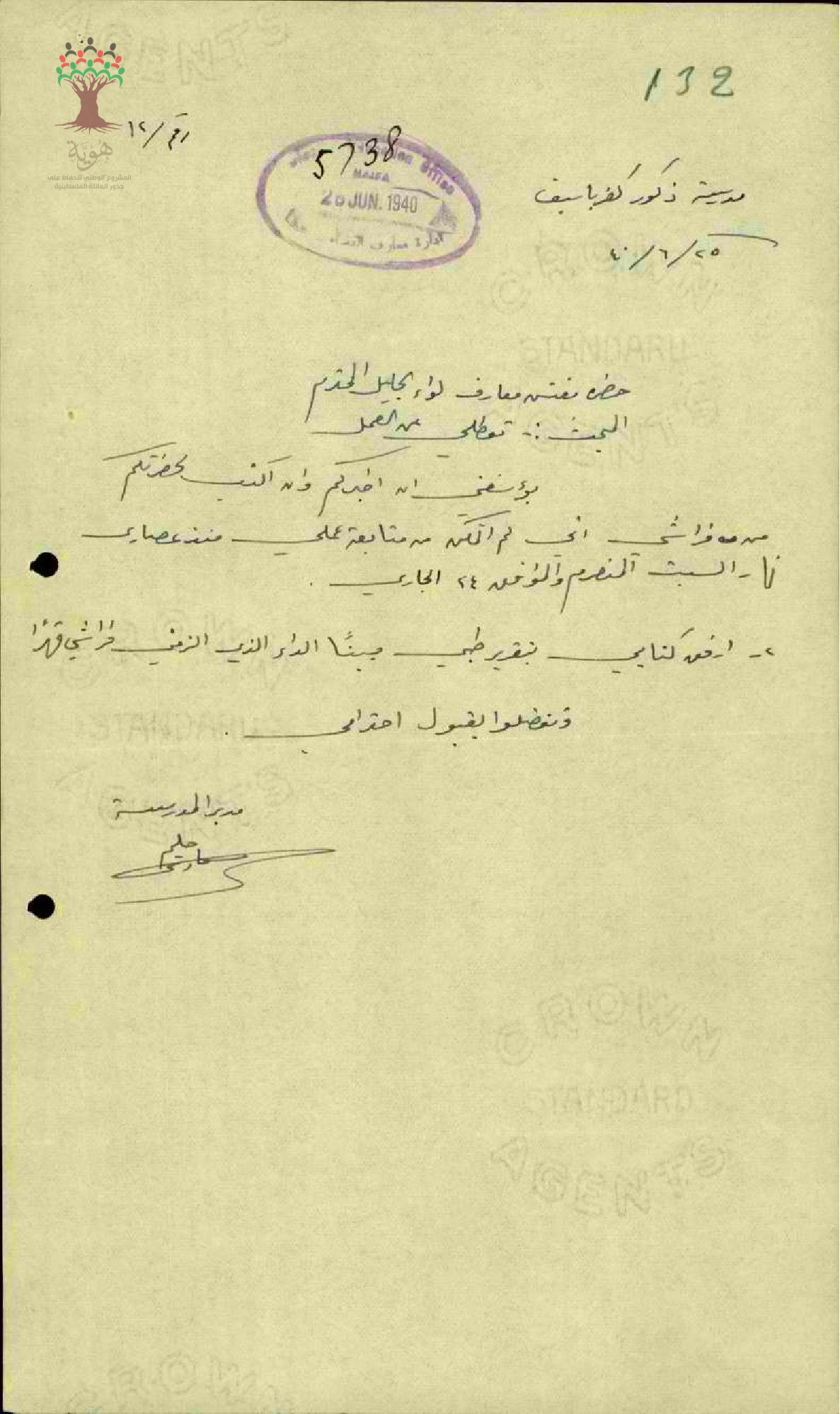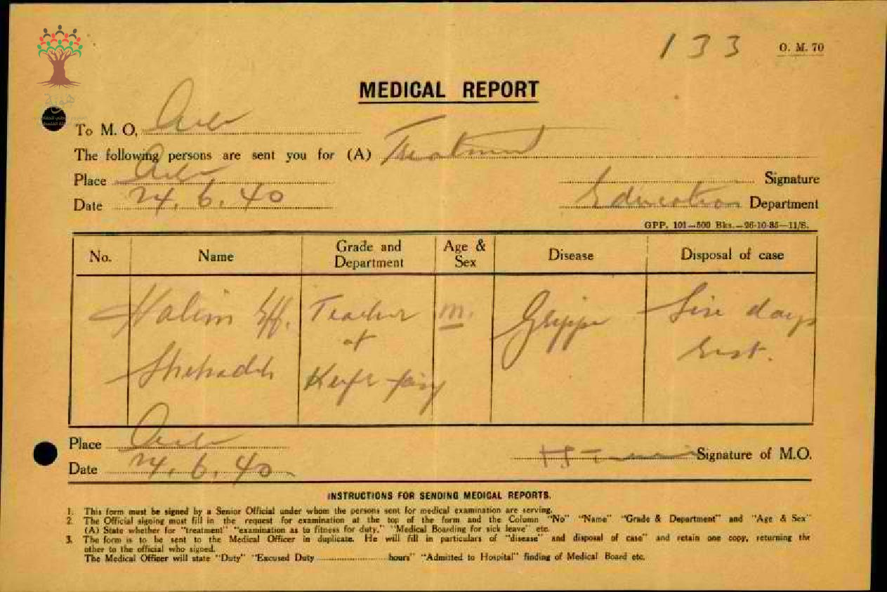 رسالة من المعلم حليم شحادة الى مفتش المعارف بخصوص تغيبه عن العمل مرفقة بالتقرير الطبي