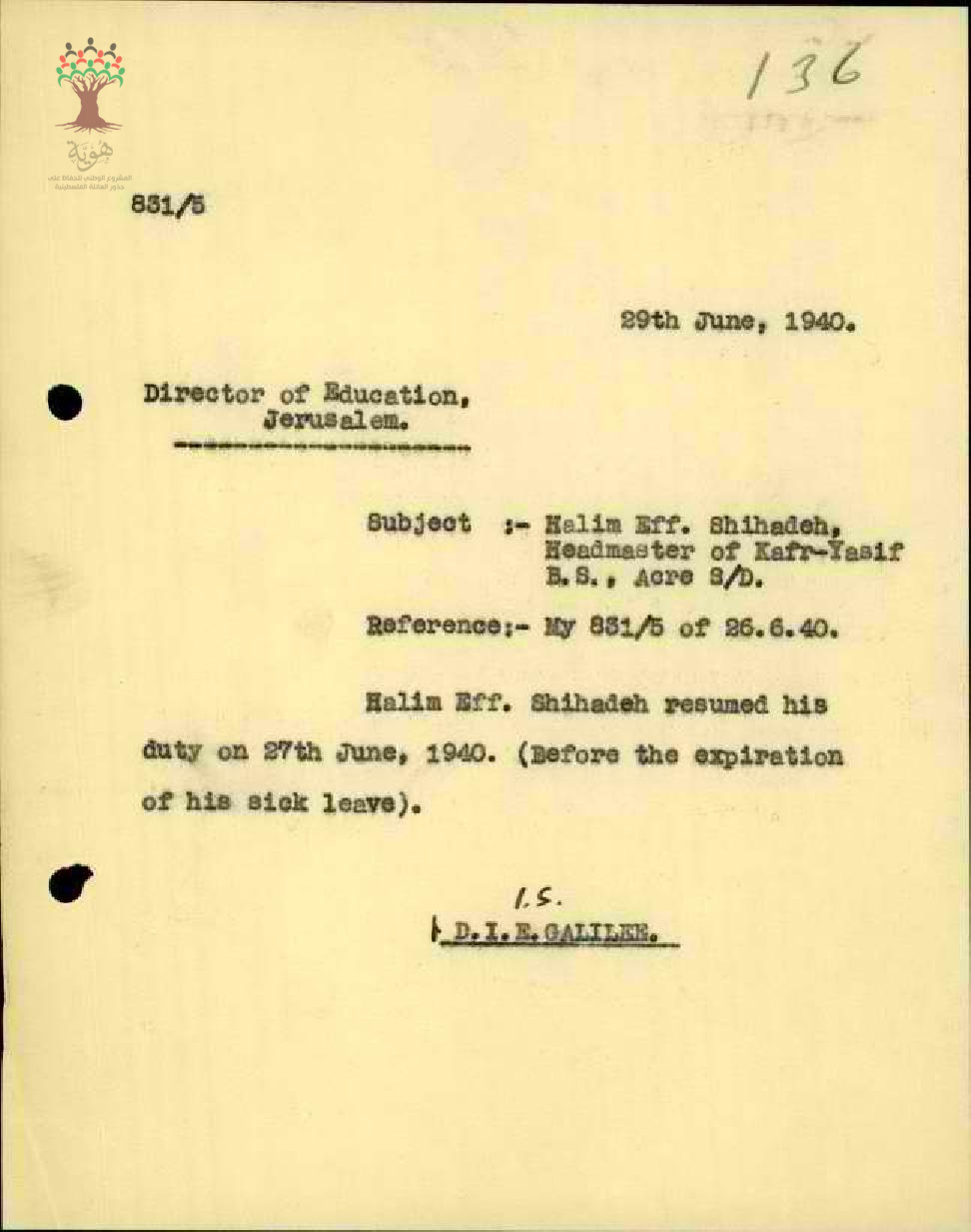 رسالة من مفتش المعارف الى مدير المعارف بخصوص عودة المعلم حليم شحادة الى العمل