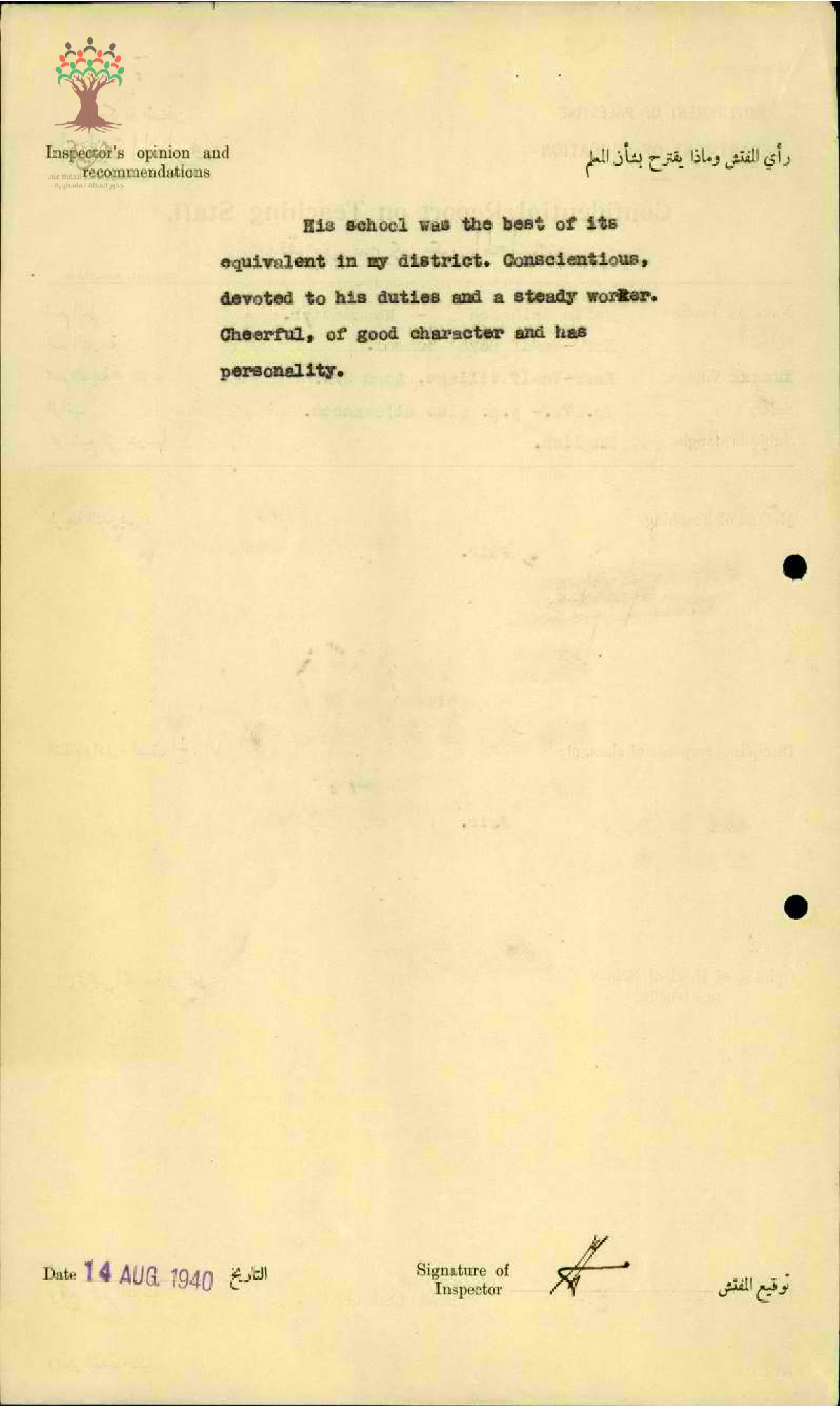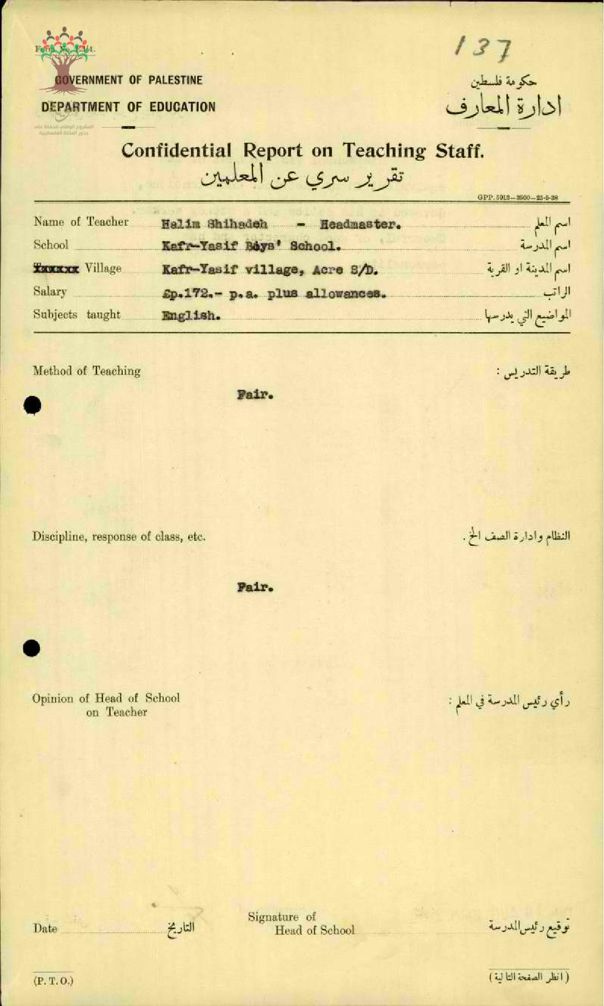 تقرير تفصيلي عن أداء المعلم حليم شحادة في مدرسة كفر ياسيف سنة 1940