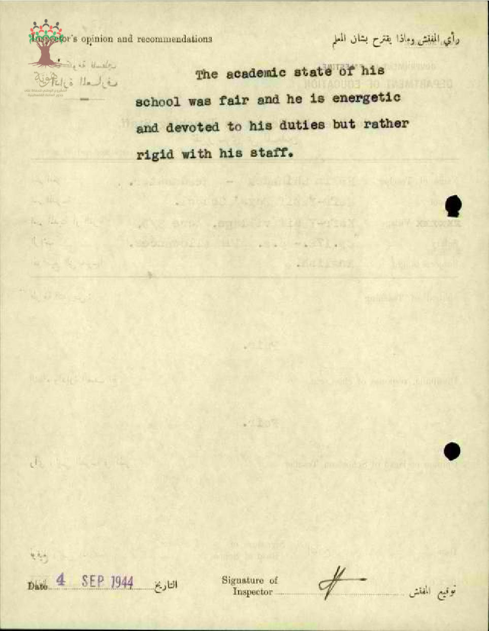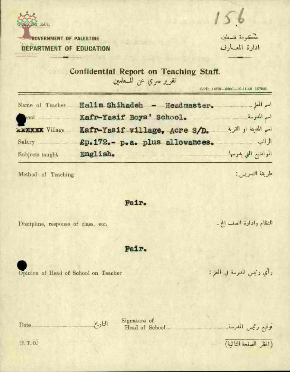 تقرير تفصيلي عن أداء المعلم حليم شحادة في مدرسة كفر ياسيف سنة 1944