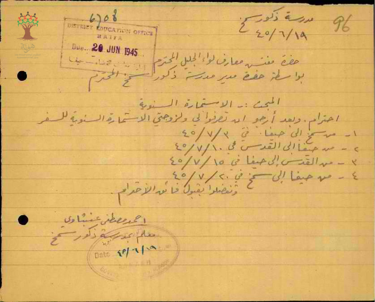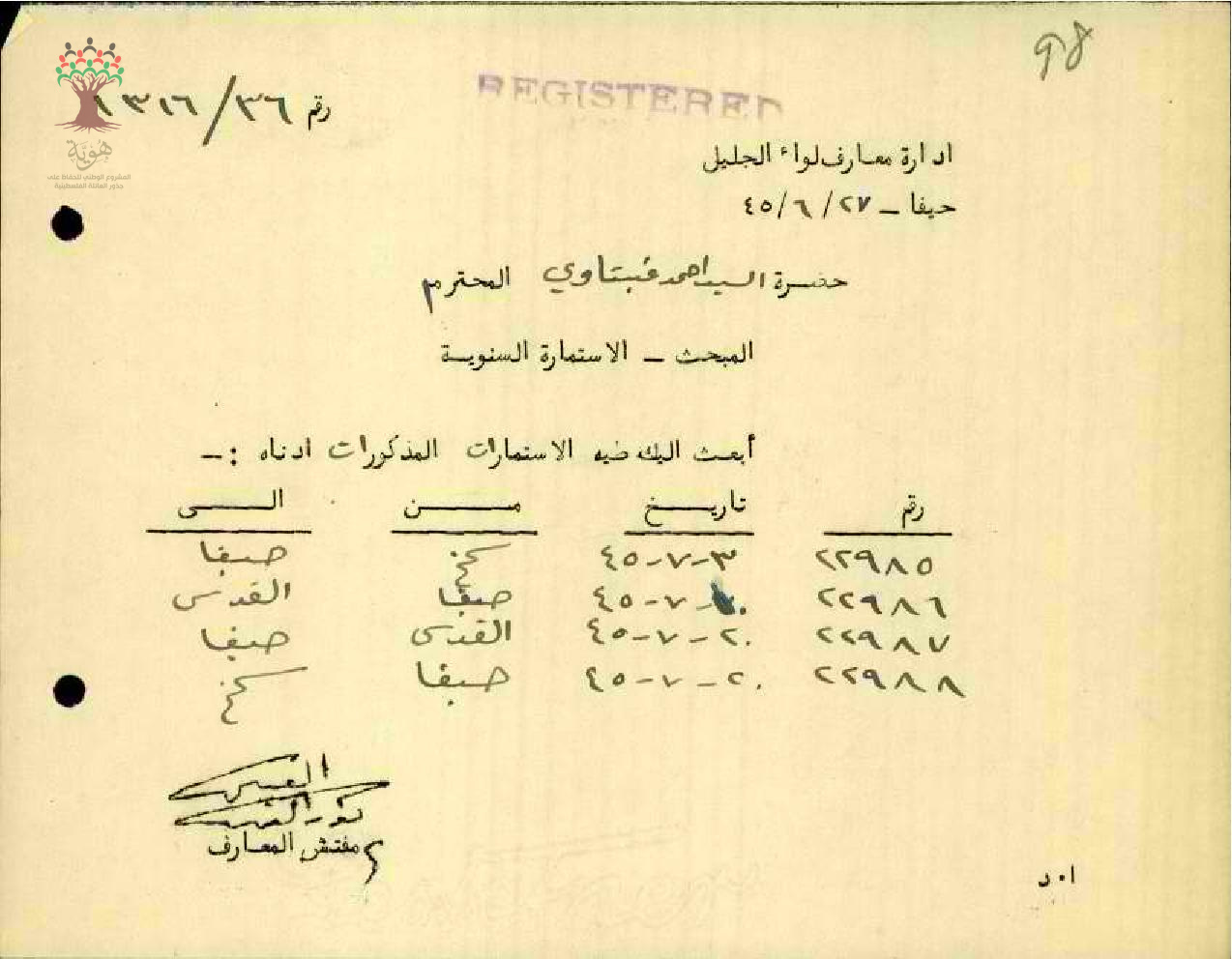رسالة من المعلم أحمد عنبتاوي إلى مفتش المعارف يطلب الاستمارة السنوية