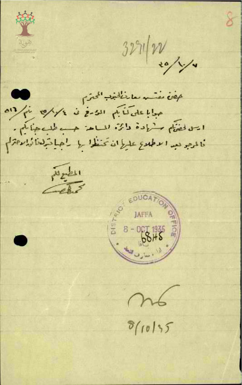 رسالة من المعلم محمد الخطيب إلى مفتش المعارف يرسل فيها شهادة دائرة المساحة حسب طلبه