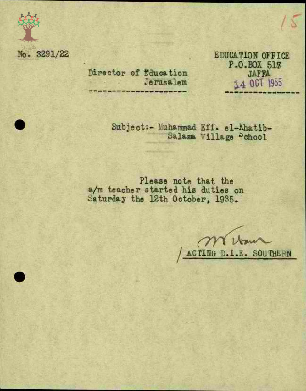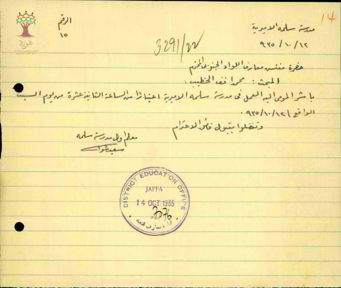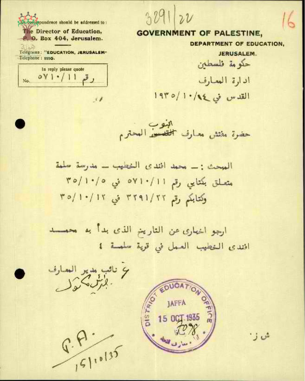 رسالة من معلم أول مدرسة سلمة إلى مفتش المعارف يخبره بمباشرة المعلم محمد الخطيب عمله ف المدرسة