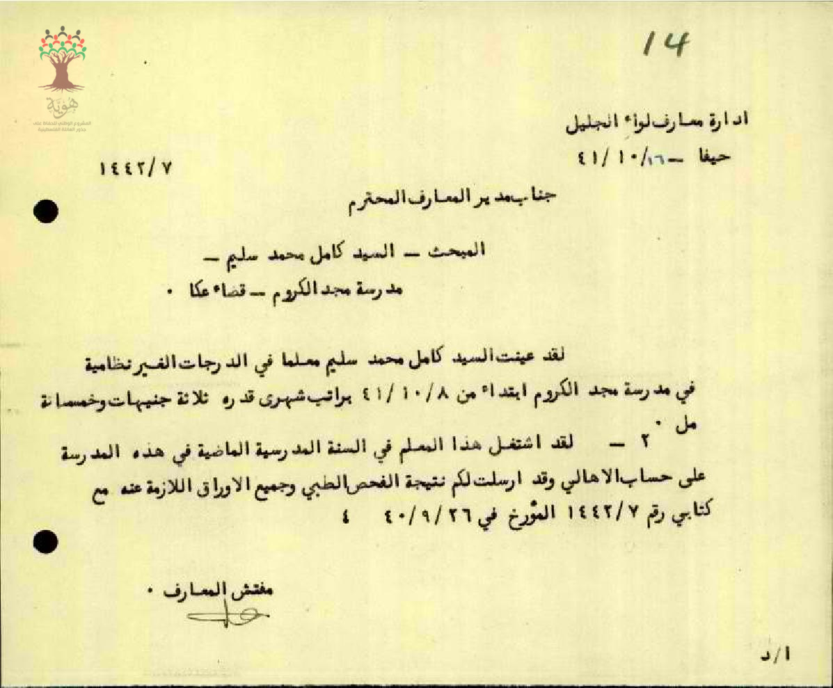 رسالة من مفتش المعارف الى مدير المعارف بخصوص تعيين المعلم كامل سليم محمود