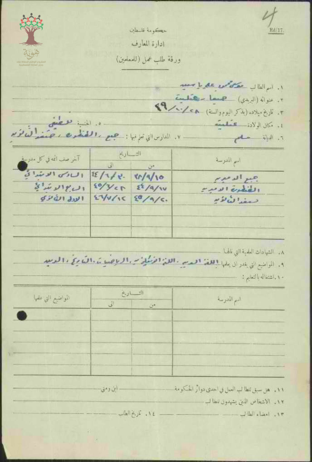 ورقة طلب عمل للمعلم موسى ياسين/عتليت