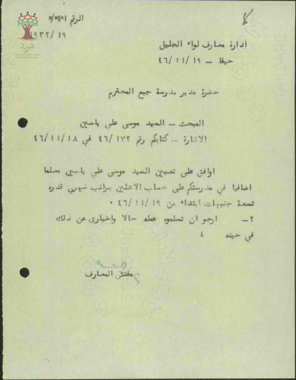 رسالة من مفتش المعارف الى مدير مدرسة جبع يوافق فيها على تعيين المعلم موسى ياسين في مدرسة جبع
