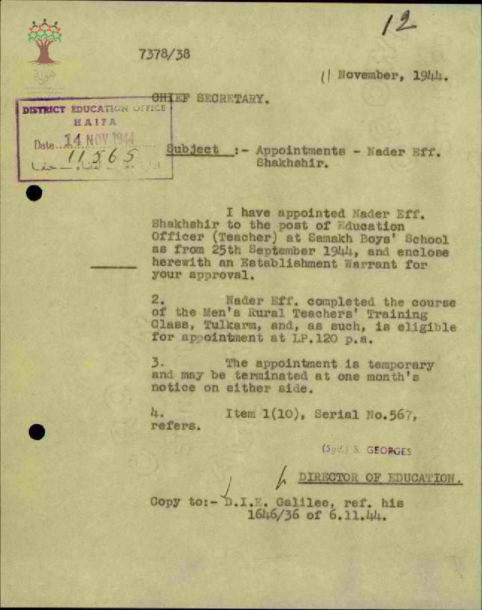 رسالة من مدير المعارف الى رئيس السكرتارية بخصوص تعيين المعلم نادر الشخشير