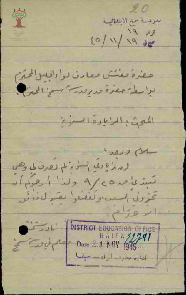 رسالة من المعلم نادر الشخشير الى مفتش المعارق يسأل فيها عن زيادته السنوية