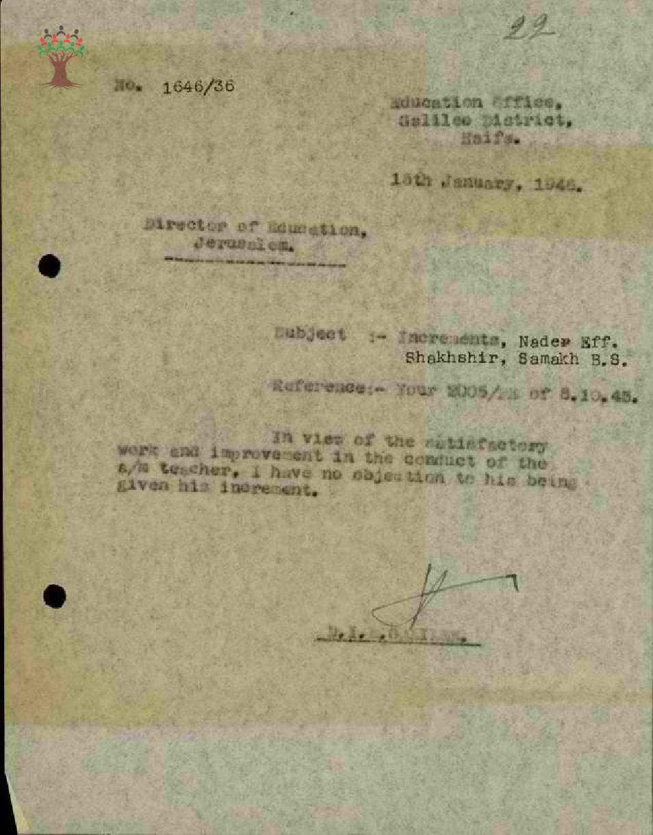رسالة من مفتش المعارف الى مدير المعارف بخصوص زيادة راتب المعلم نادر الشخشير السنوية