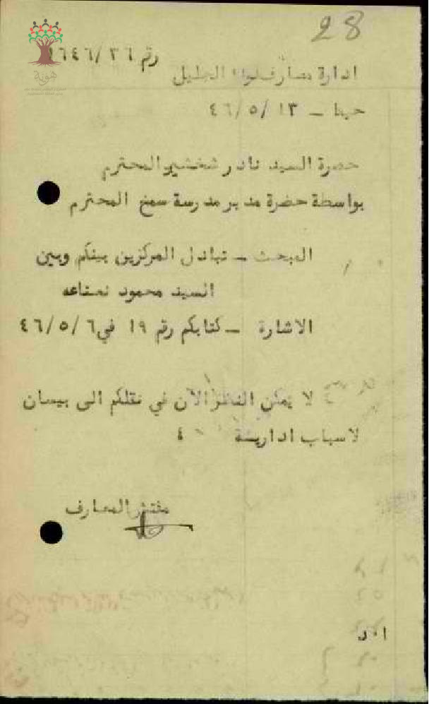 رسالة من مفتش المعارف الى المعلم نادر الشخشير بخصوص عدم امكانية نقله