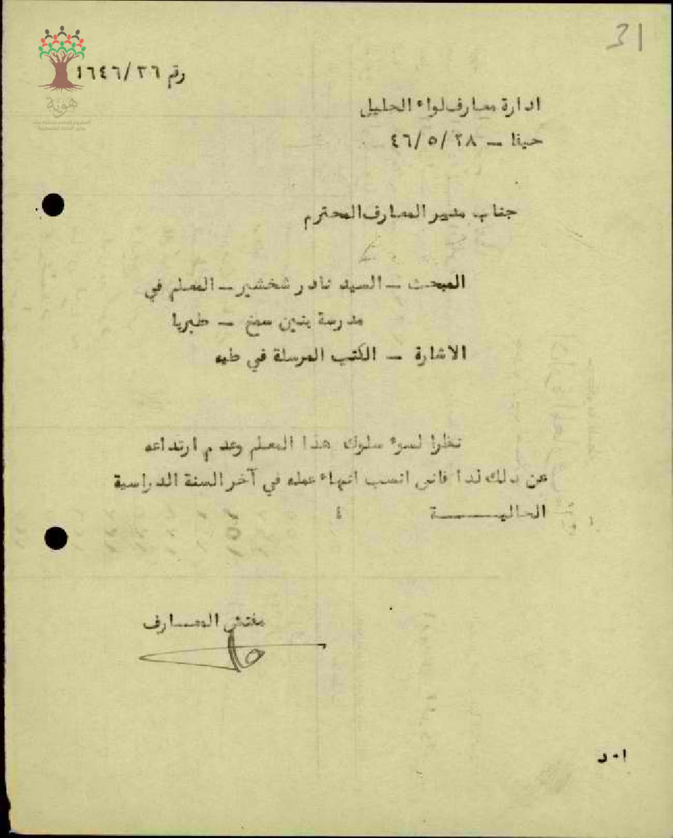 رسالة من مفتش المعارف الى مدير المعارف بخصوص سلوك المعلم نادر الشخشير