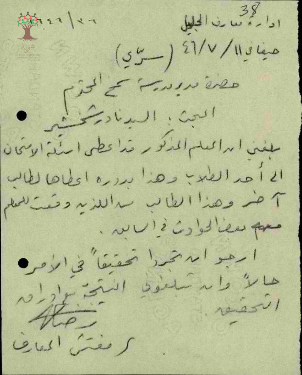 رسالة سرية من مفتش المعارف الى مدير مدرسة سمخ يبحث معه حادثة حصلت مع المعلم نادر الشخشير