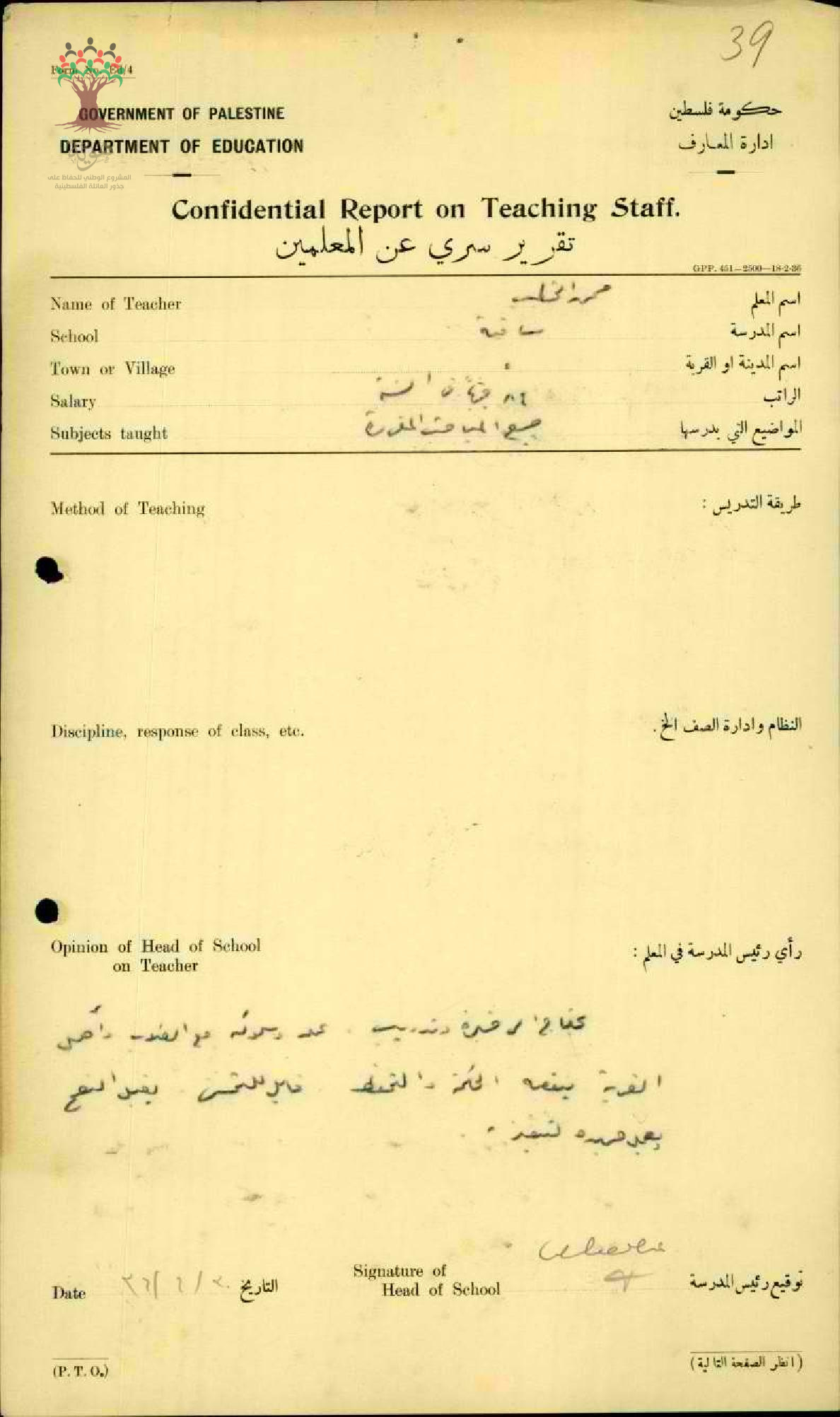 تقرير تفصيلي عن أداء المعلم محمد الخطيب في مدرسة ساقية سنة 1936
