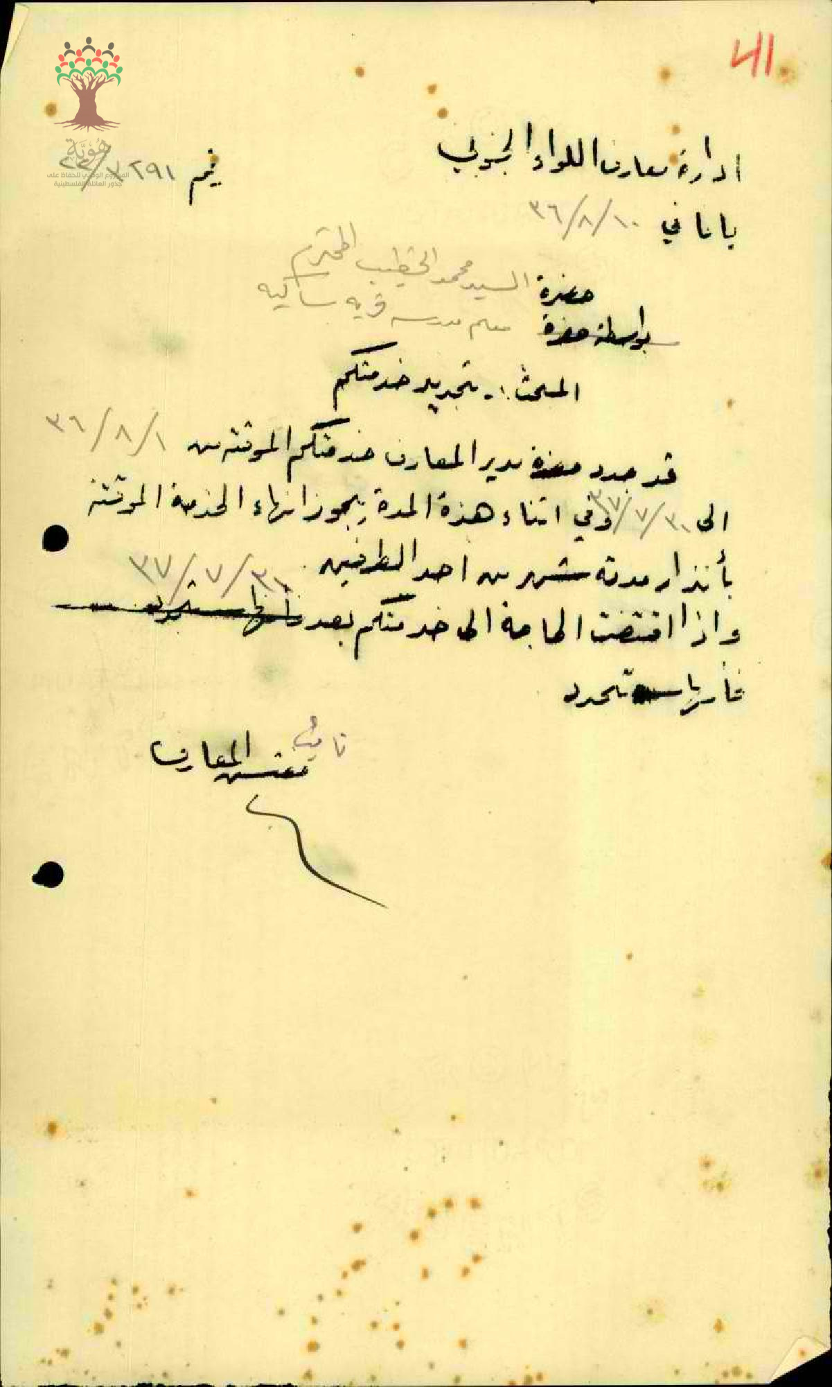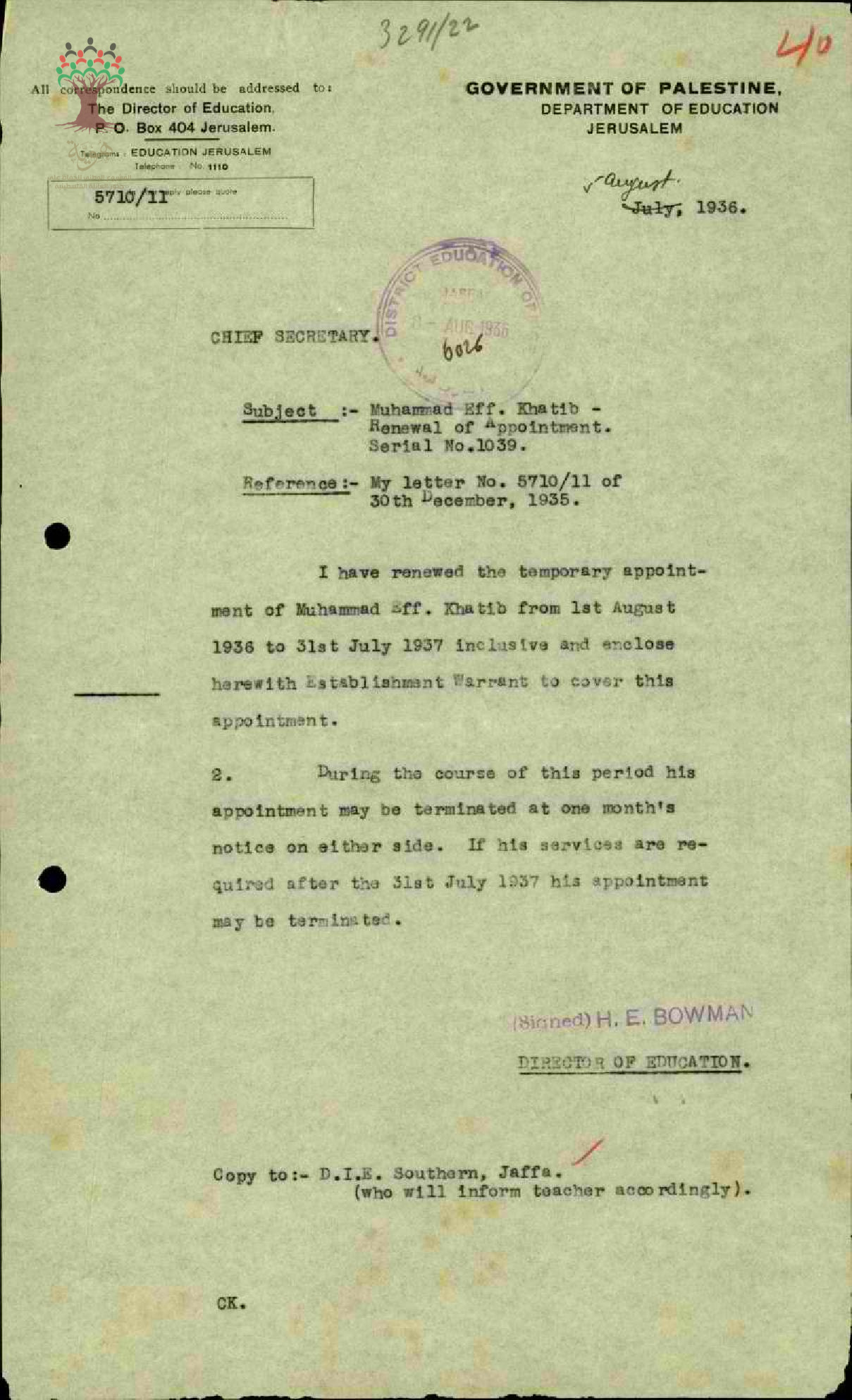 رسالة من مدير المعارف إلى السكرتير العام يبحث تجديد تعيين المعلم محمد الخطيب في الإدارة