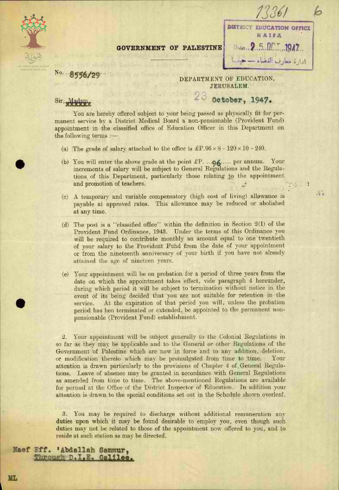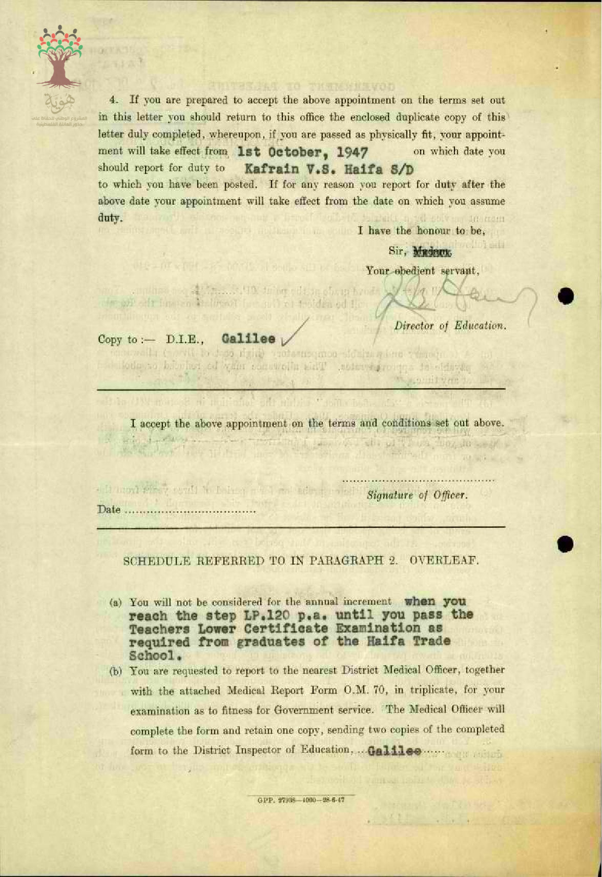 توقيع المعلم نايف غبد الله سمور على شروط التعيين