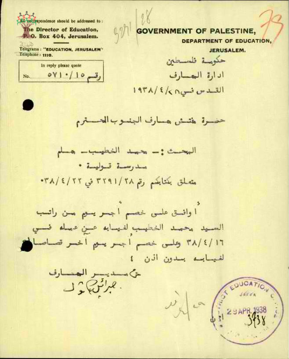 رسالة من مدير المعارف إلى مفتش المعارف يعلمه بموافقته على خصم أجر يوم من راتب المعلم محمد الخطيب
