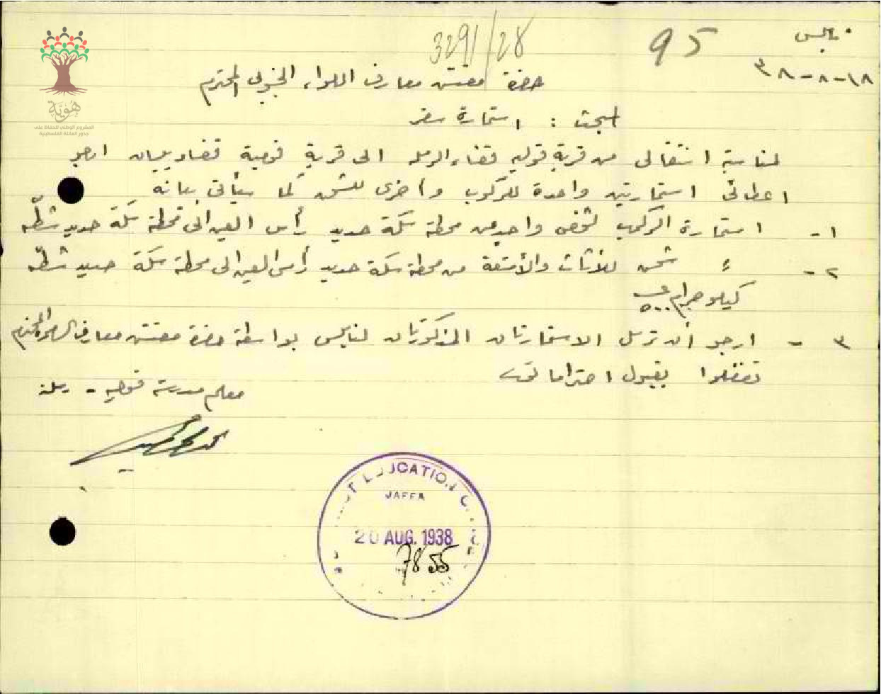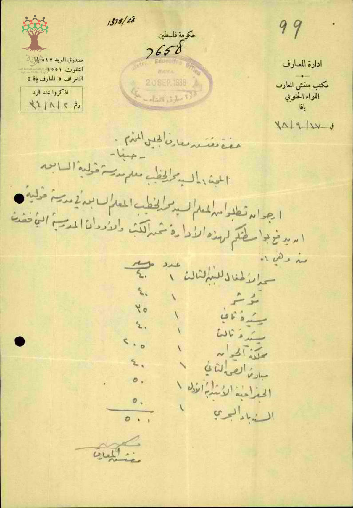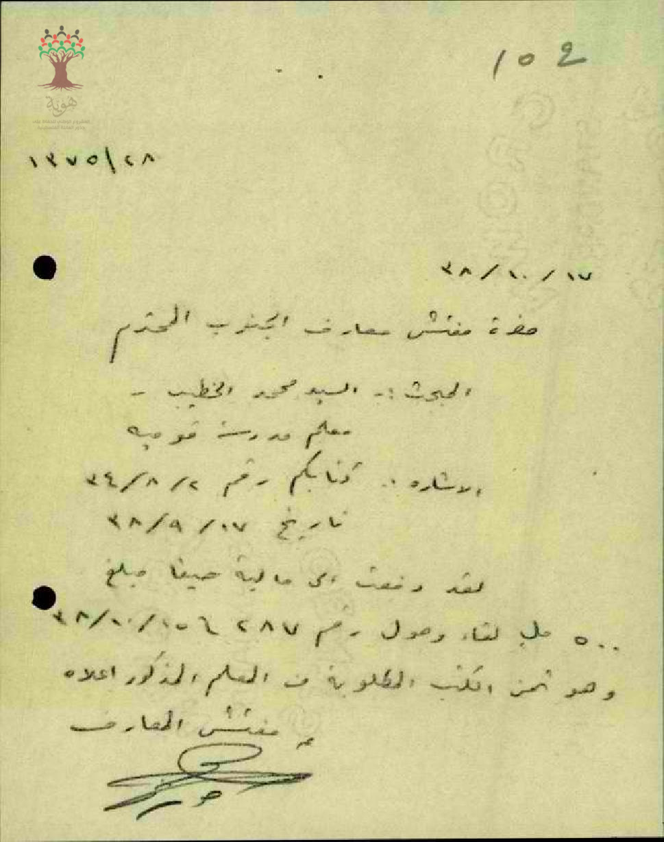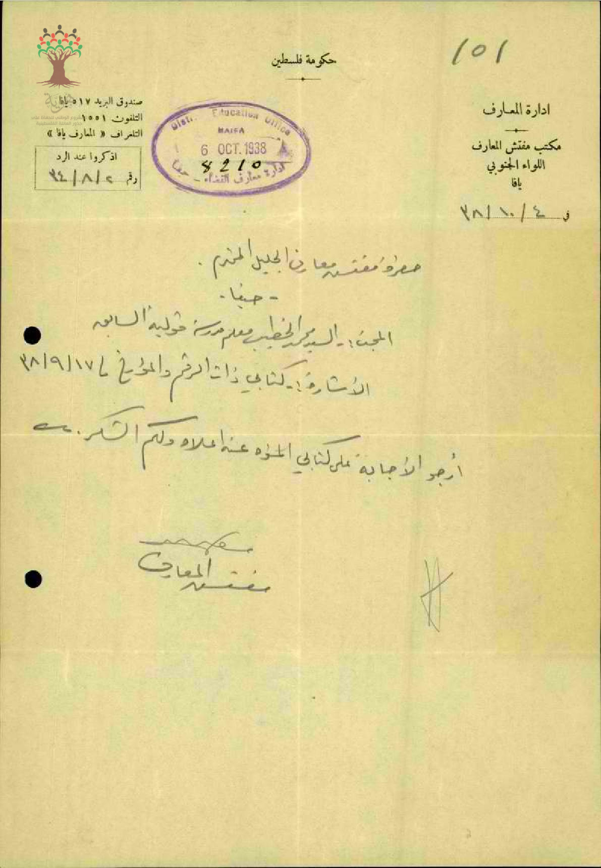 رسالة من المعلم محمد الخطيب إلى مفتش المعارف يطلب استمارة سفر ونقل