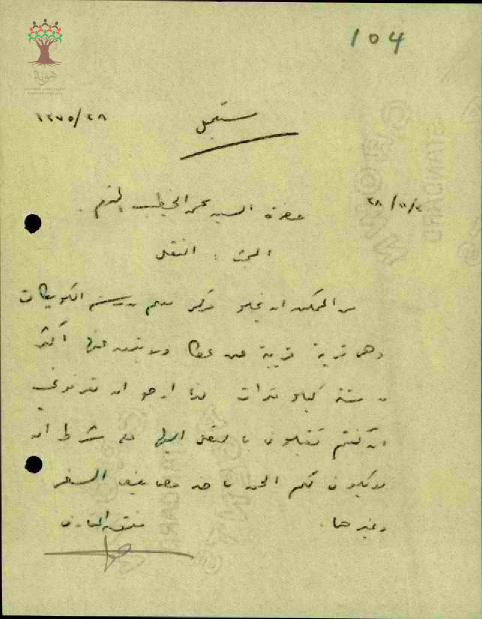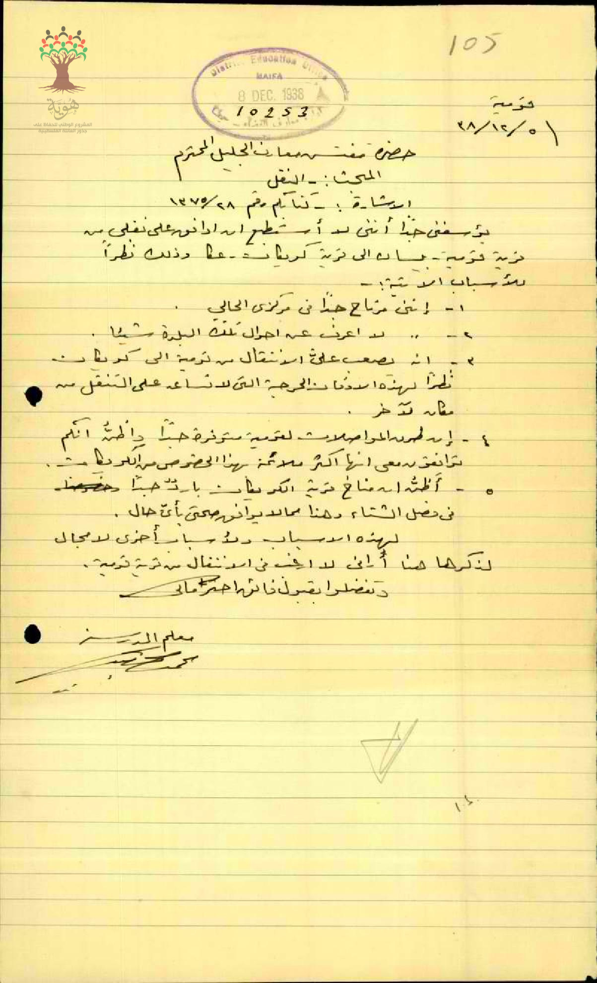 رسالة من مفتش المعارف إلى المعلم محمد الخطيب يطلب اخباره بموافقته على النقل