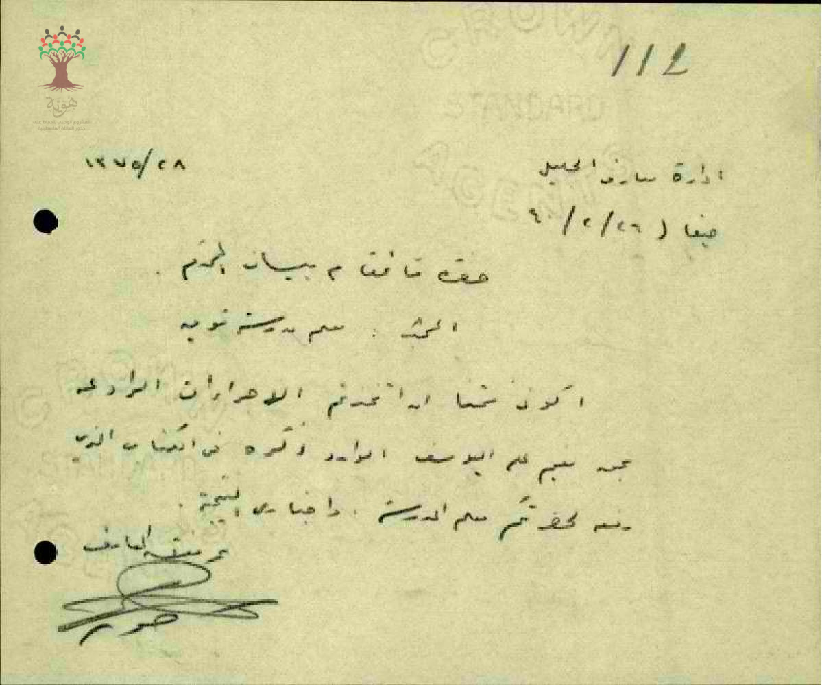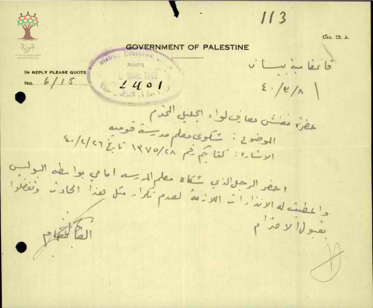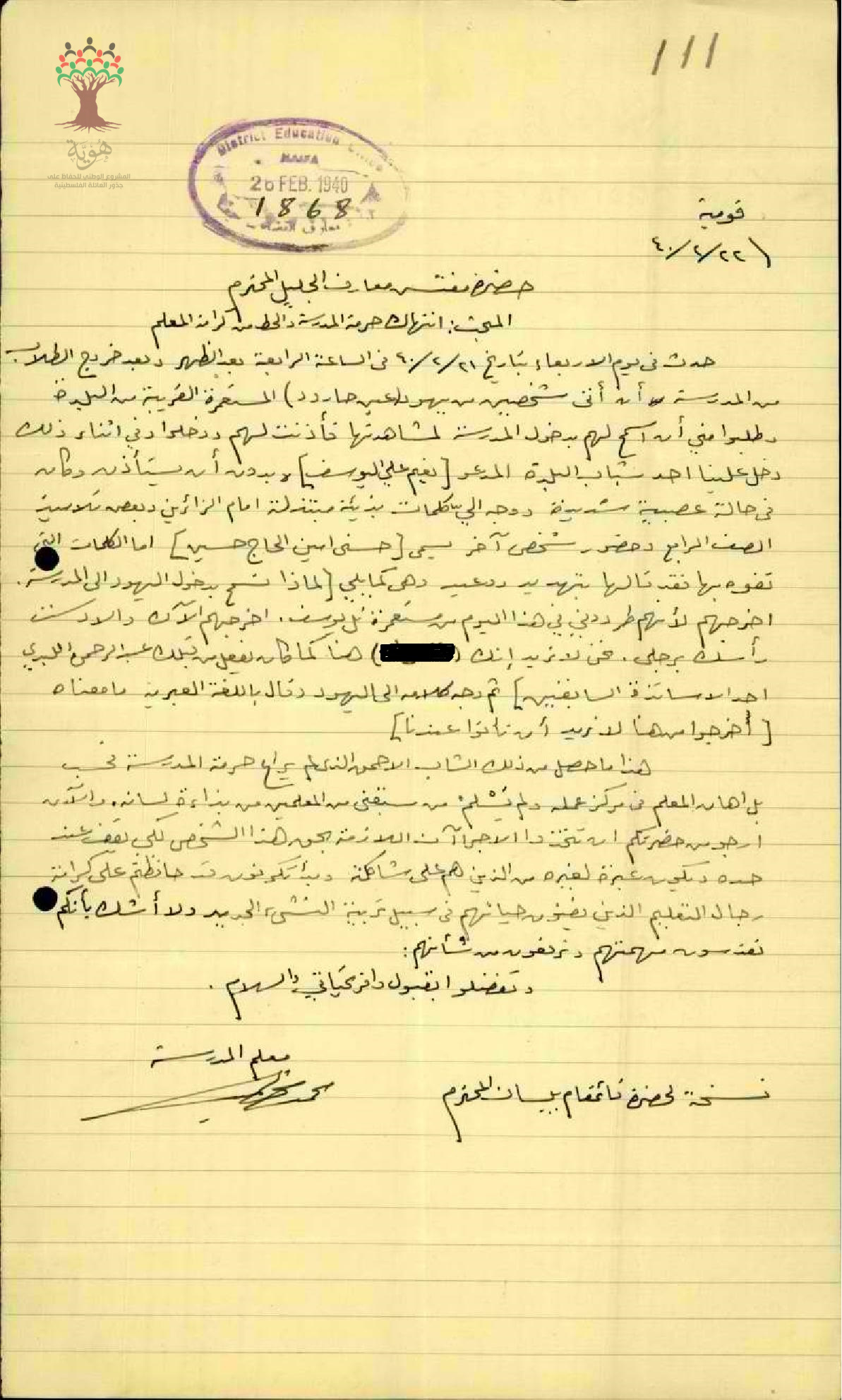 رسالة من المعلم محمد الخطيب إلى مفتش المعارف يبحث فيها انتهاك أحد المواطنين حرمة المدرسة