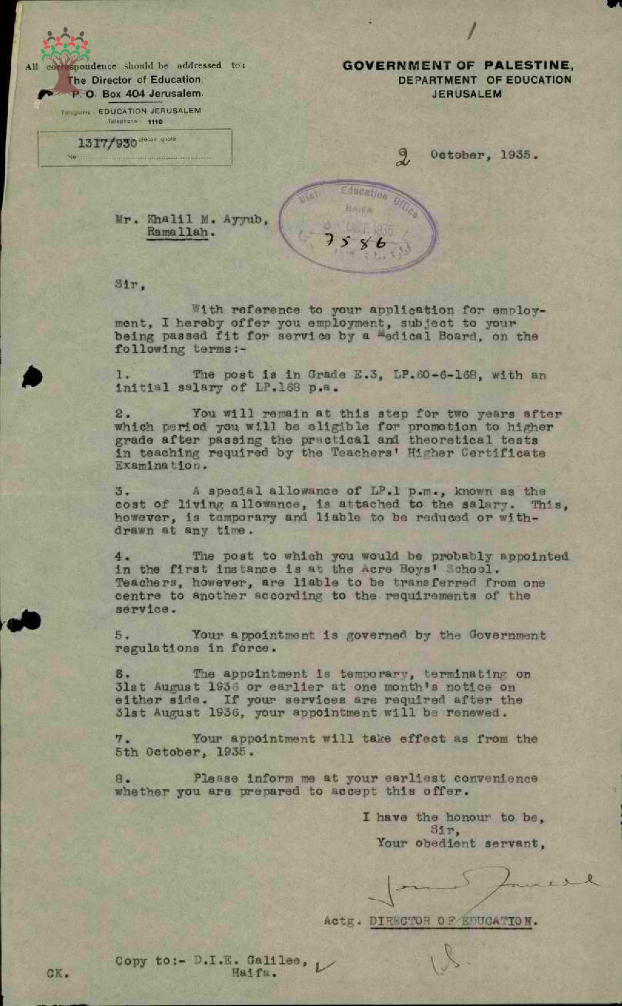 رسالة عرض عمل من مدير المعارف الى المعلم خليل أيوب