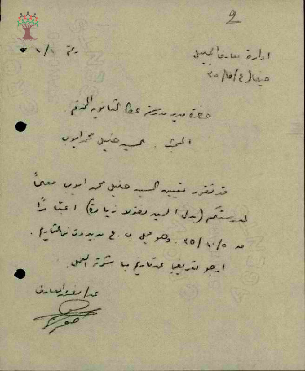 رسالة من مفتش المعارف الى مدير مدرسة عكا الثانوية بخصوص تعيين المعلم خليل ايوب معلما في المدرسة