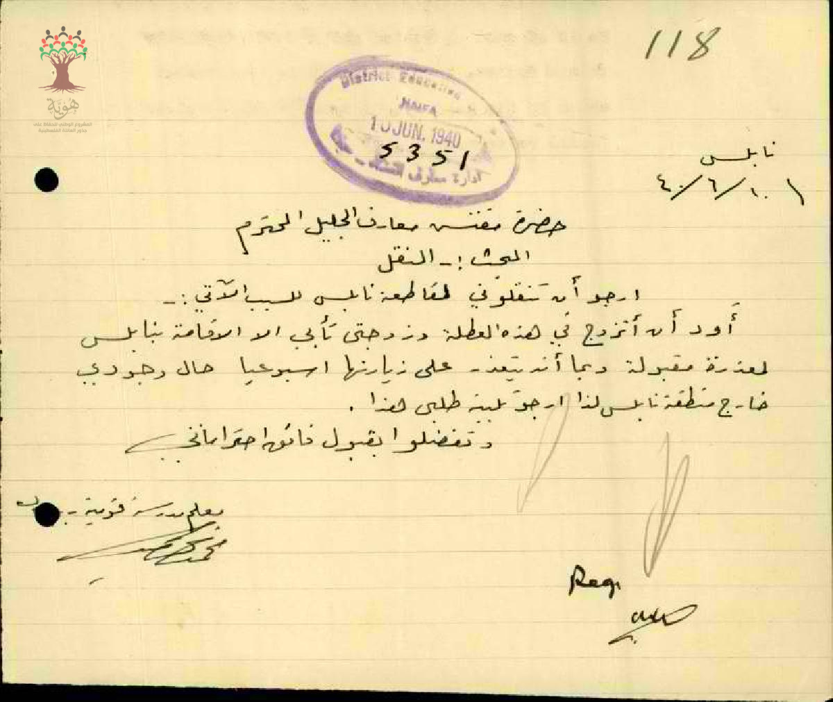 رسالة من المعلم محمد الخطيب إلى مفتش المعارف يطلب نقله إلى مقاطعة نابلس