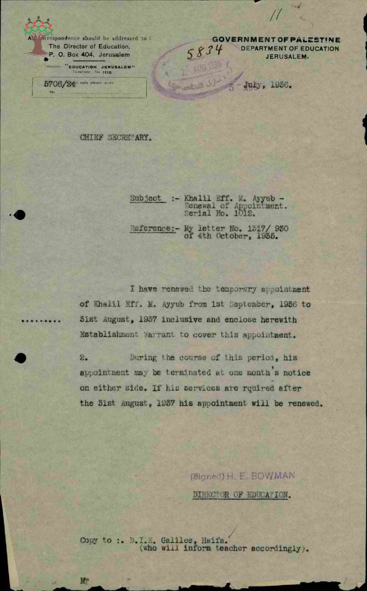 رسالة من مدير المعارف الى رئيس السكرتارية بخصوص تجديد عقد عمل المعلم خليل ايوب
