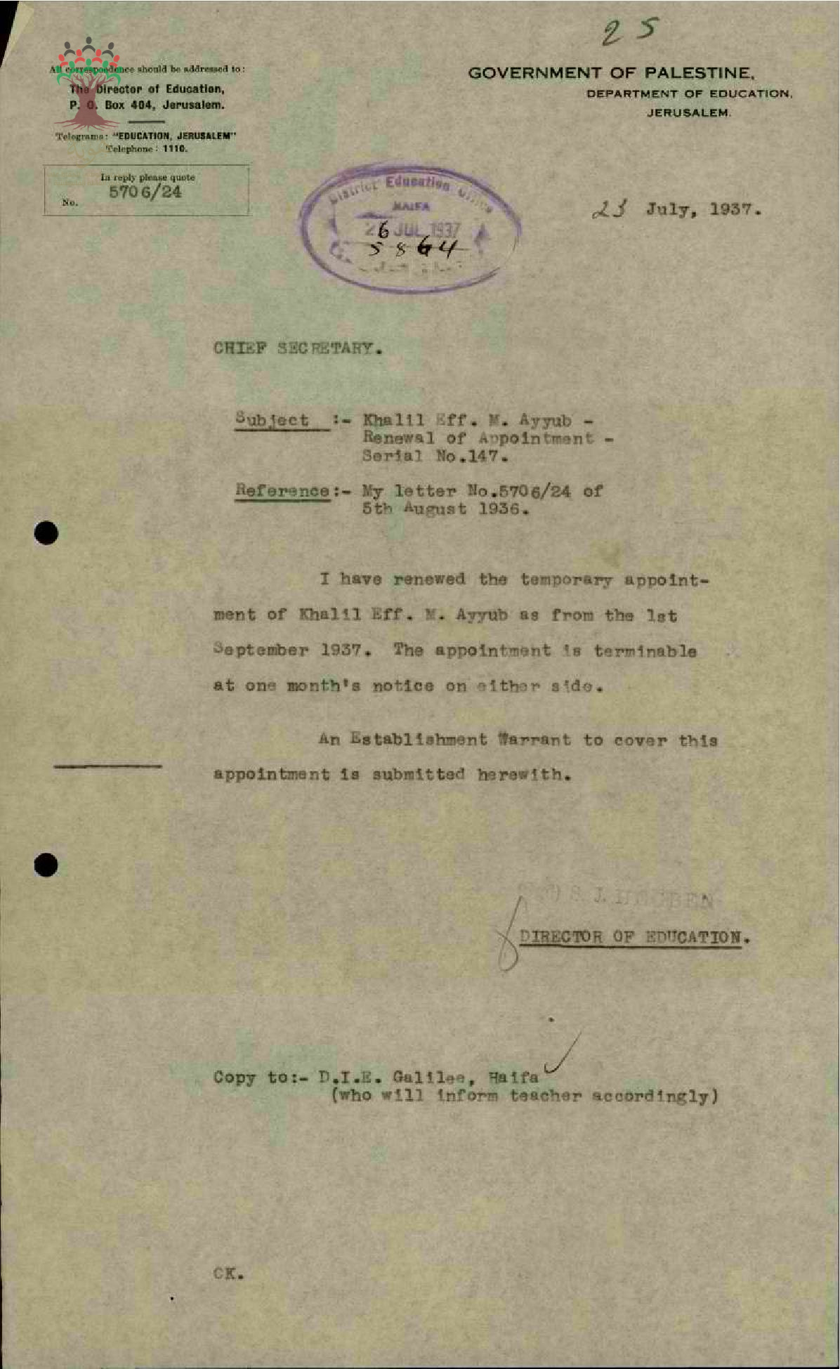رسالة من مدير المعارف الى رئيس السكرتارية بخصوص إعادة تعيين المعلم خليل ايوب في مدرسة عكا الثانوية
