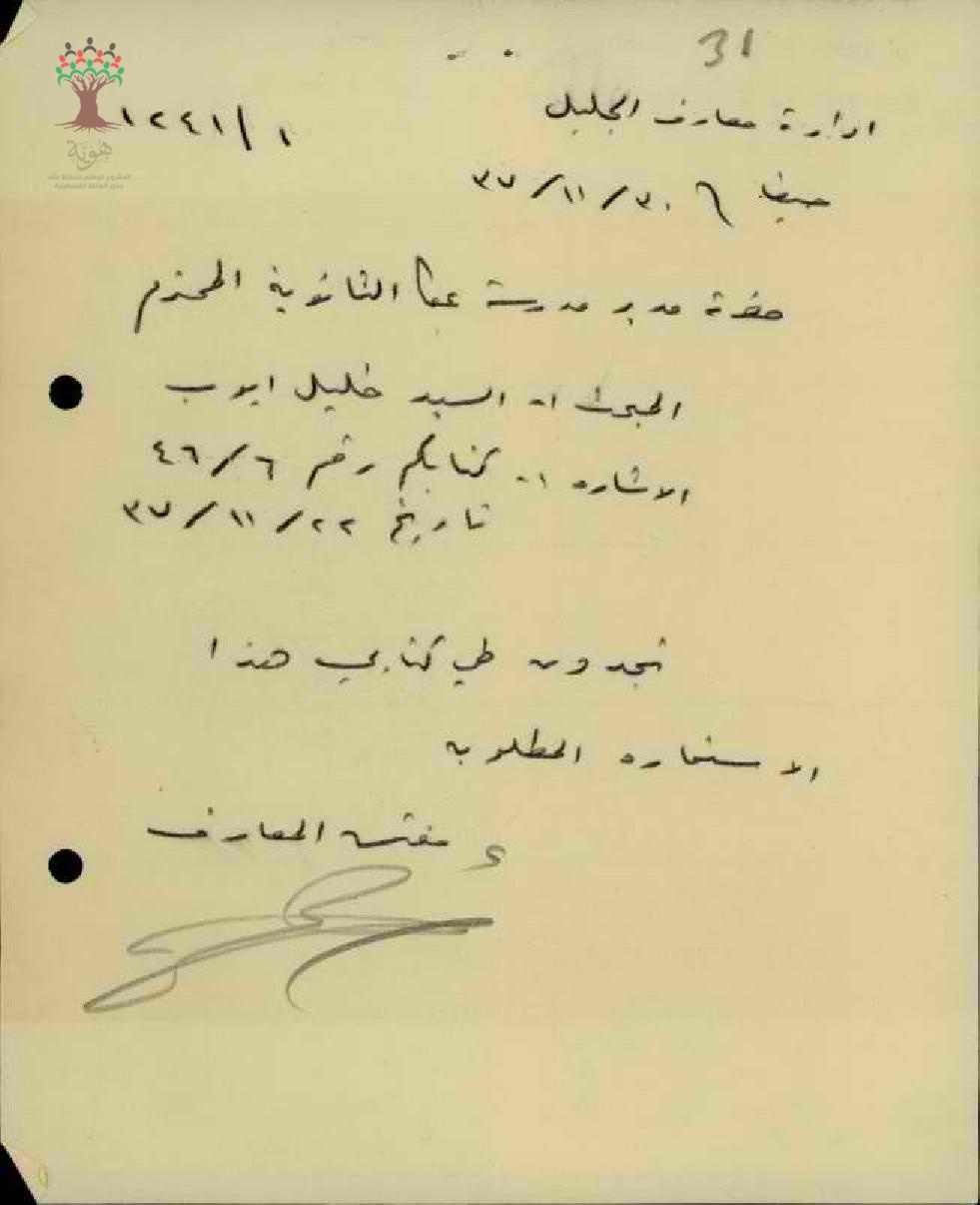 رسالة من مفتش المعارف الى مدير مدرسة عكا بخصوص استمارة المعلم خليل ايوب السنوية