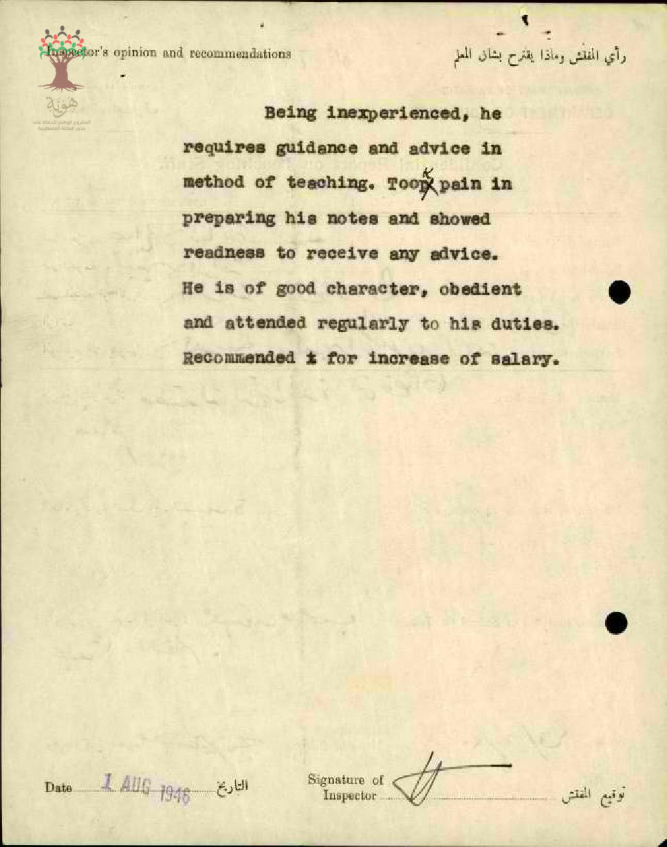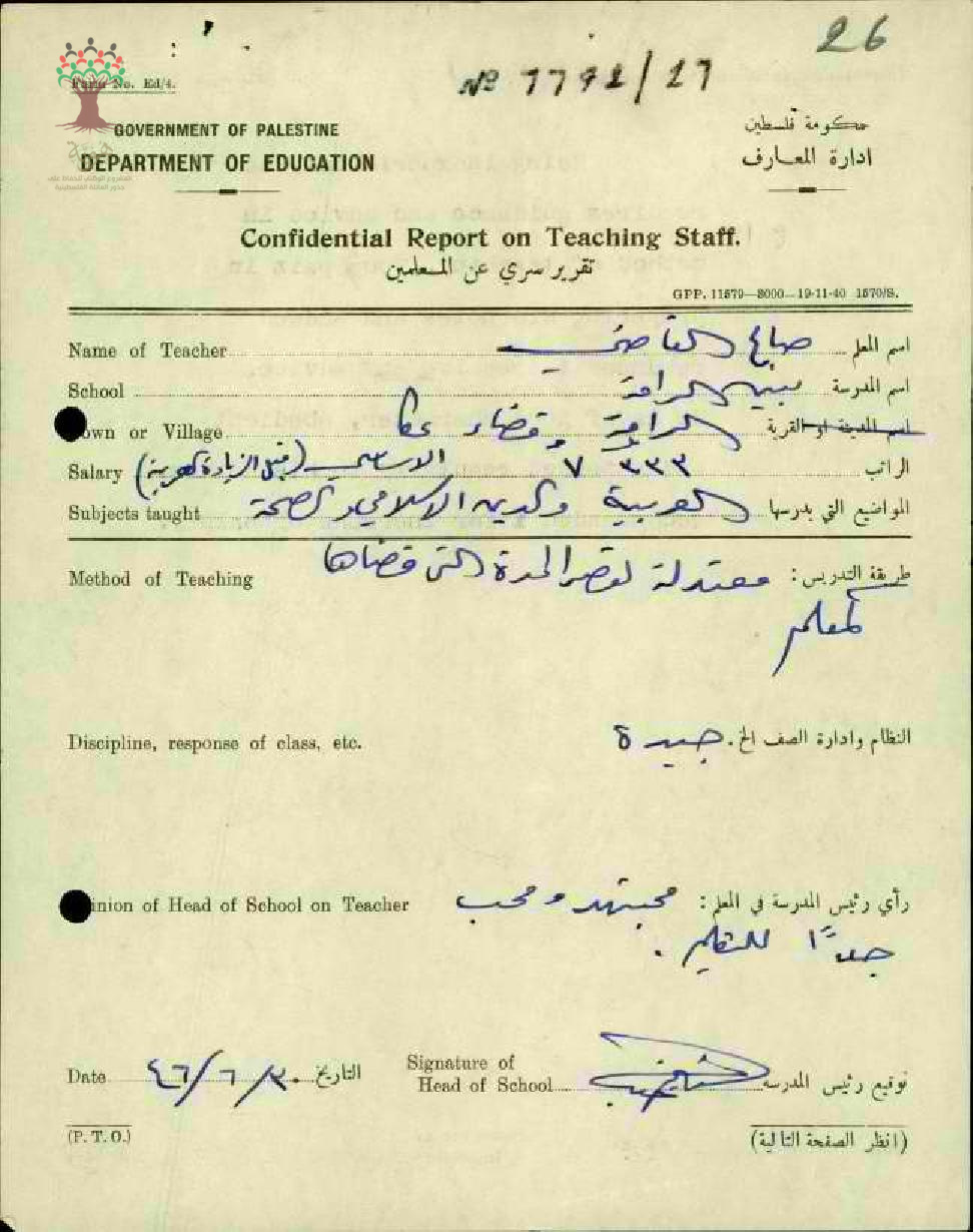 تقرير تفصيلي عن أداء المعلم صالح القاضي في مدرسة الرامة للذكور سنة 1946