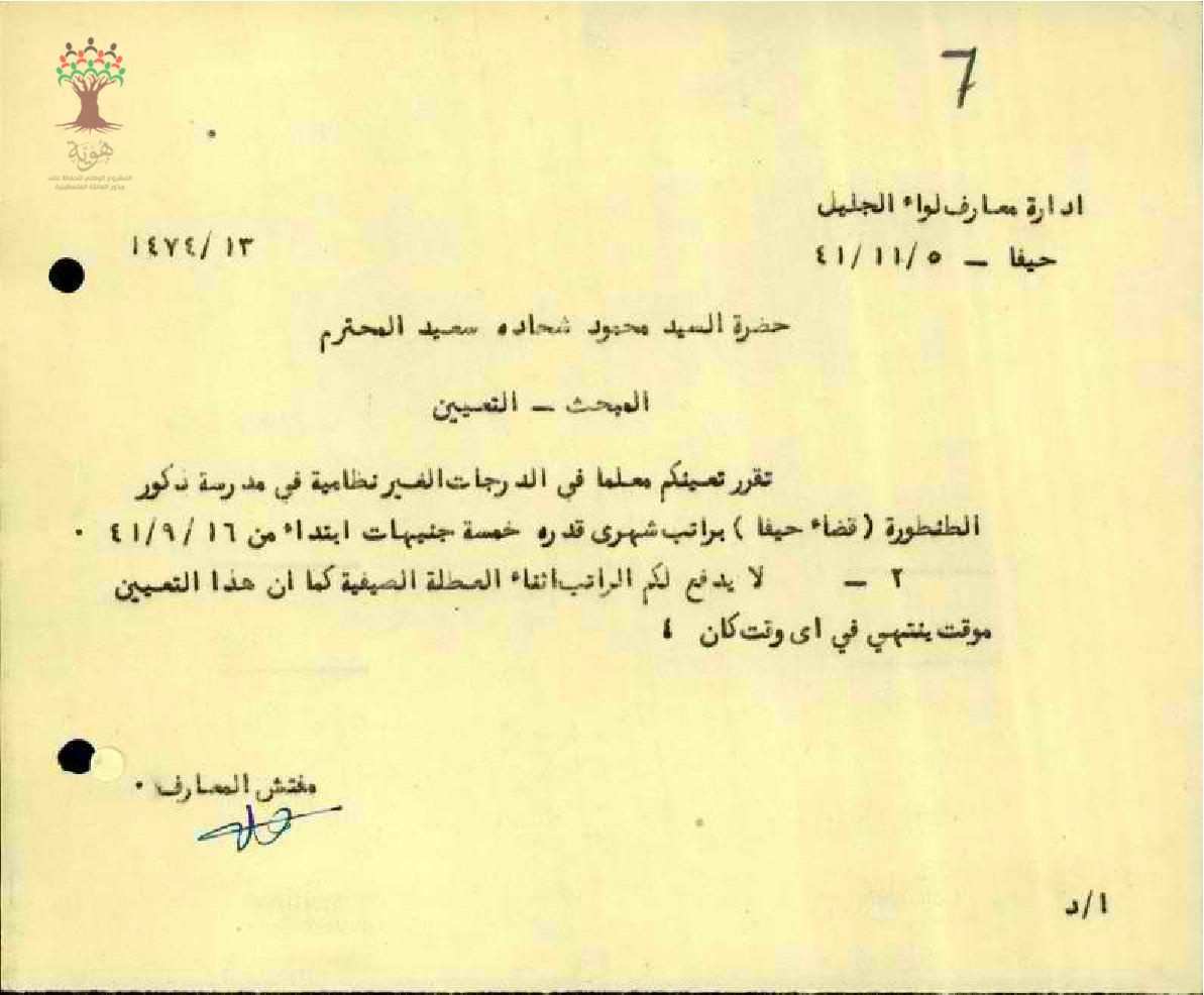 رسالة من مفتش المعارف إلى المعلم محمود السعيد يخبره بقرار تعيينه معلماً غير نظامياً في الإدارة