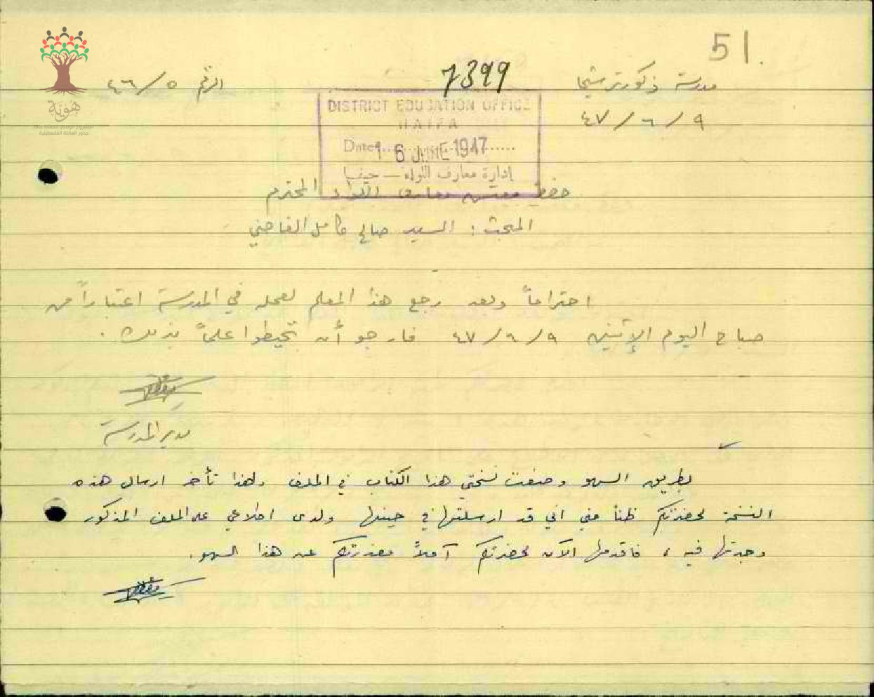 رسالة من مدير مدرسة ترشيحا الى مفتش المعارف يخبره بأن المعلم صالح القاضي قد عاد الى عمله