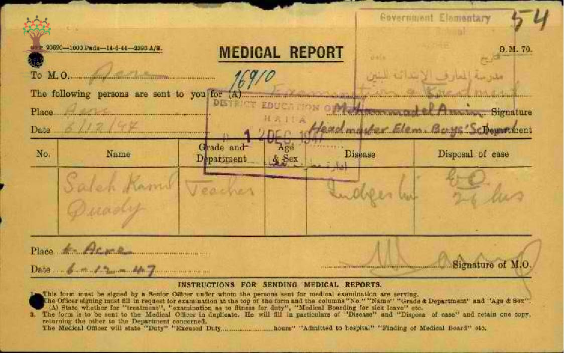 تقرير طبي عن غياب المعلم صالح القاضي-مدرسة ترشيحا