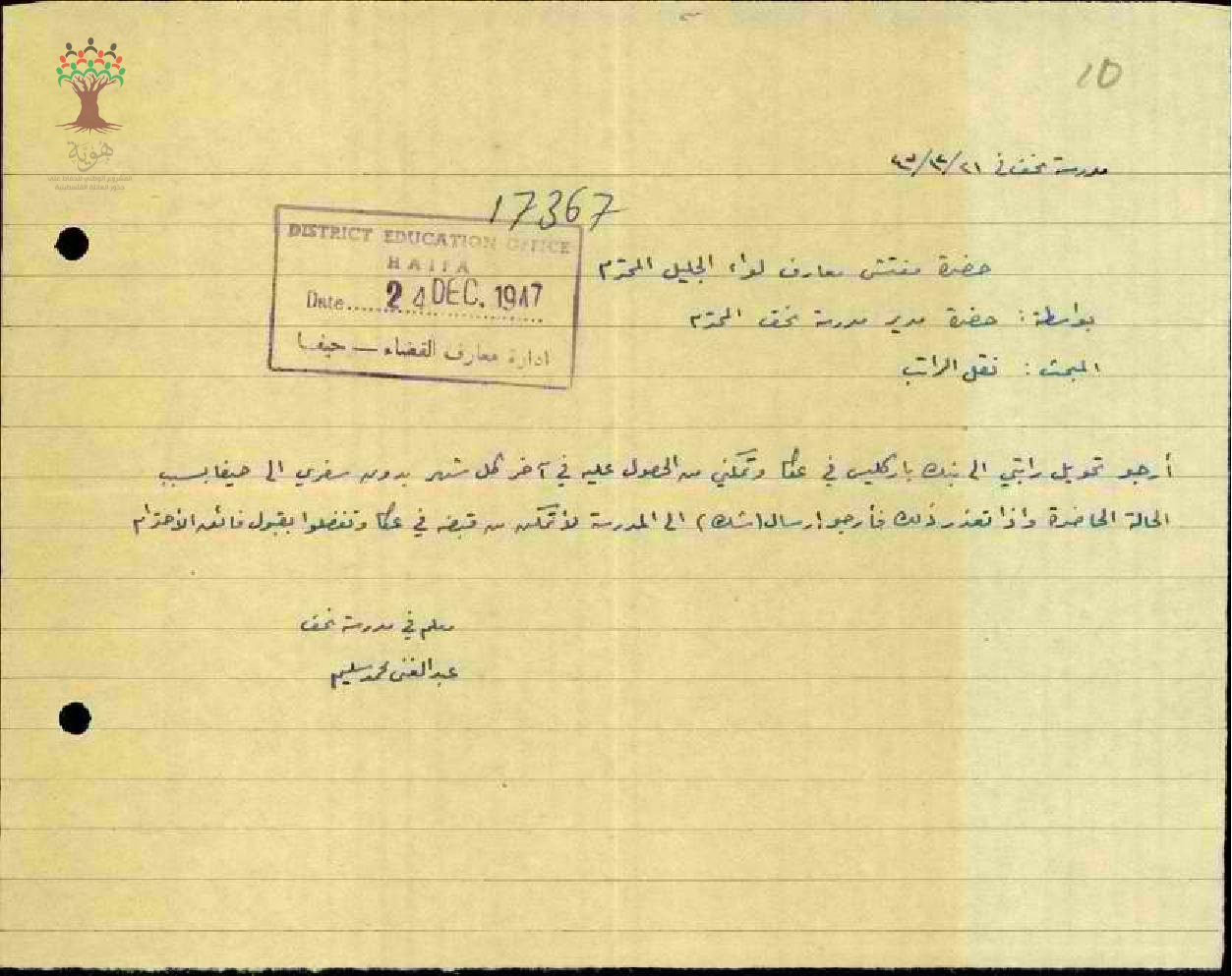 رسالة من المعلم عبد الغني طه الى مفتش المعارف بخصوص نقل راتبه