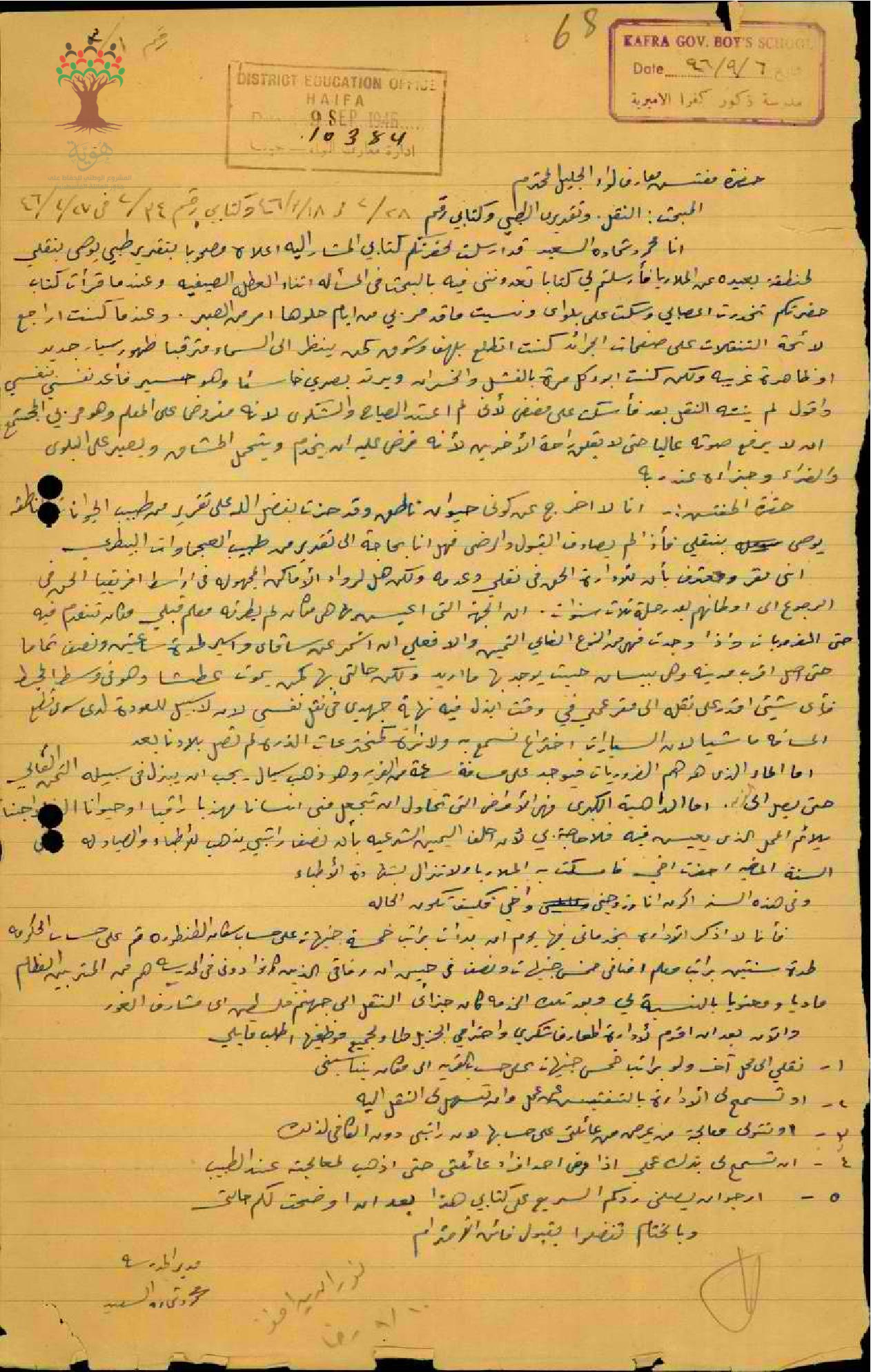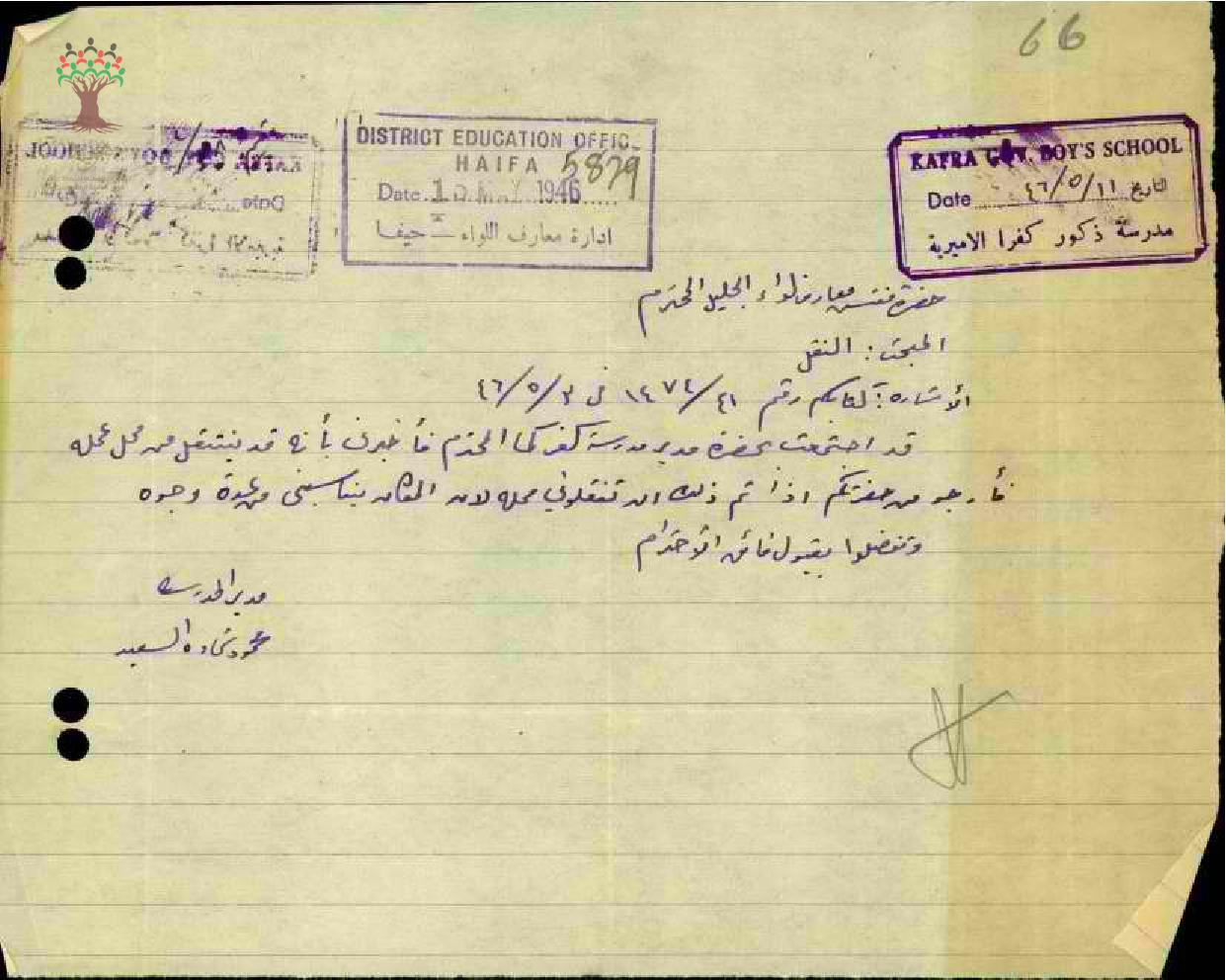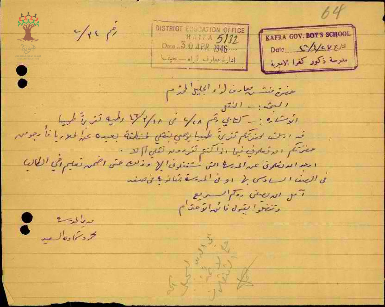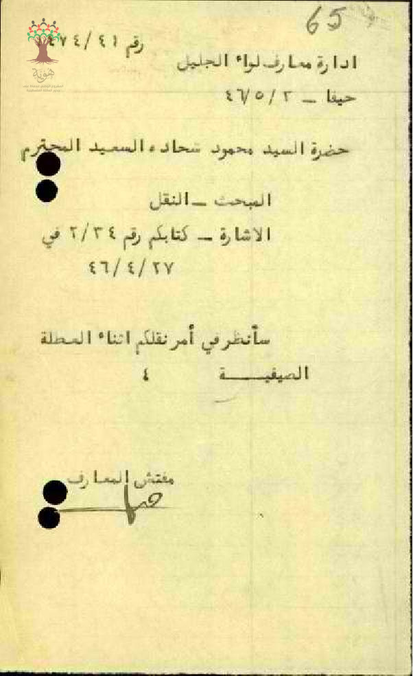 رسالة من المعلم محمود السعيد إلى مفتش المعارف يطلب نقله إلى منطقة بعيدة عن الملاريا