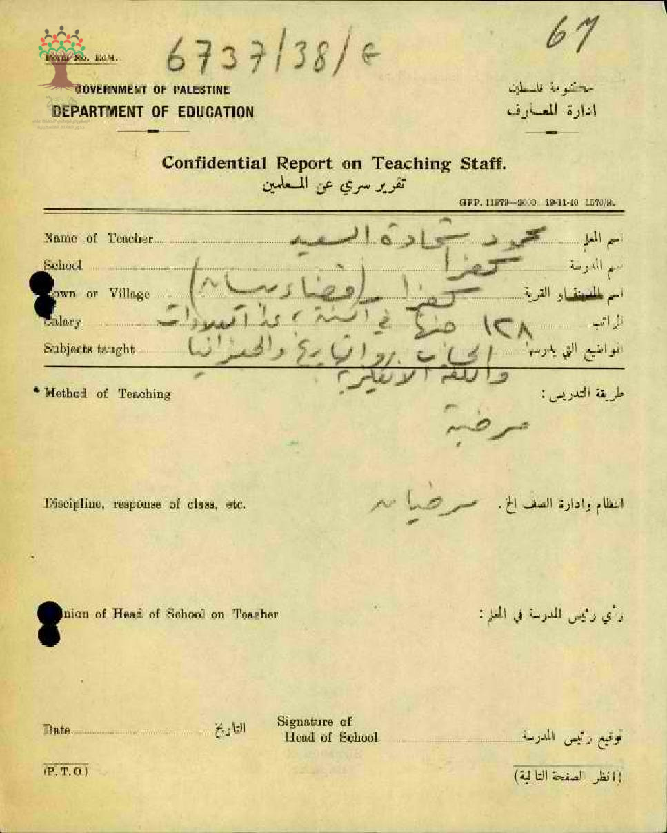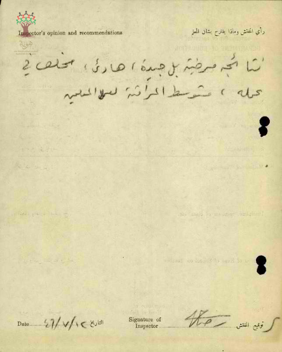 تقرير تفصيلي عن أداء المعلم محمود السعيد في مدرسة كفرا سنة 1946