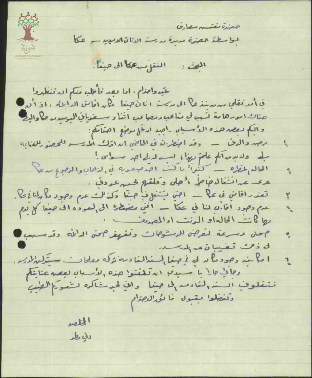 رسائل من المعلمة رنيه مطر الى مفتش المعارف تطلب نقلها من عكا الى حيفا