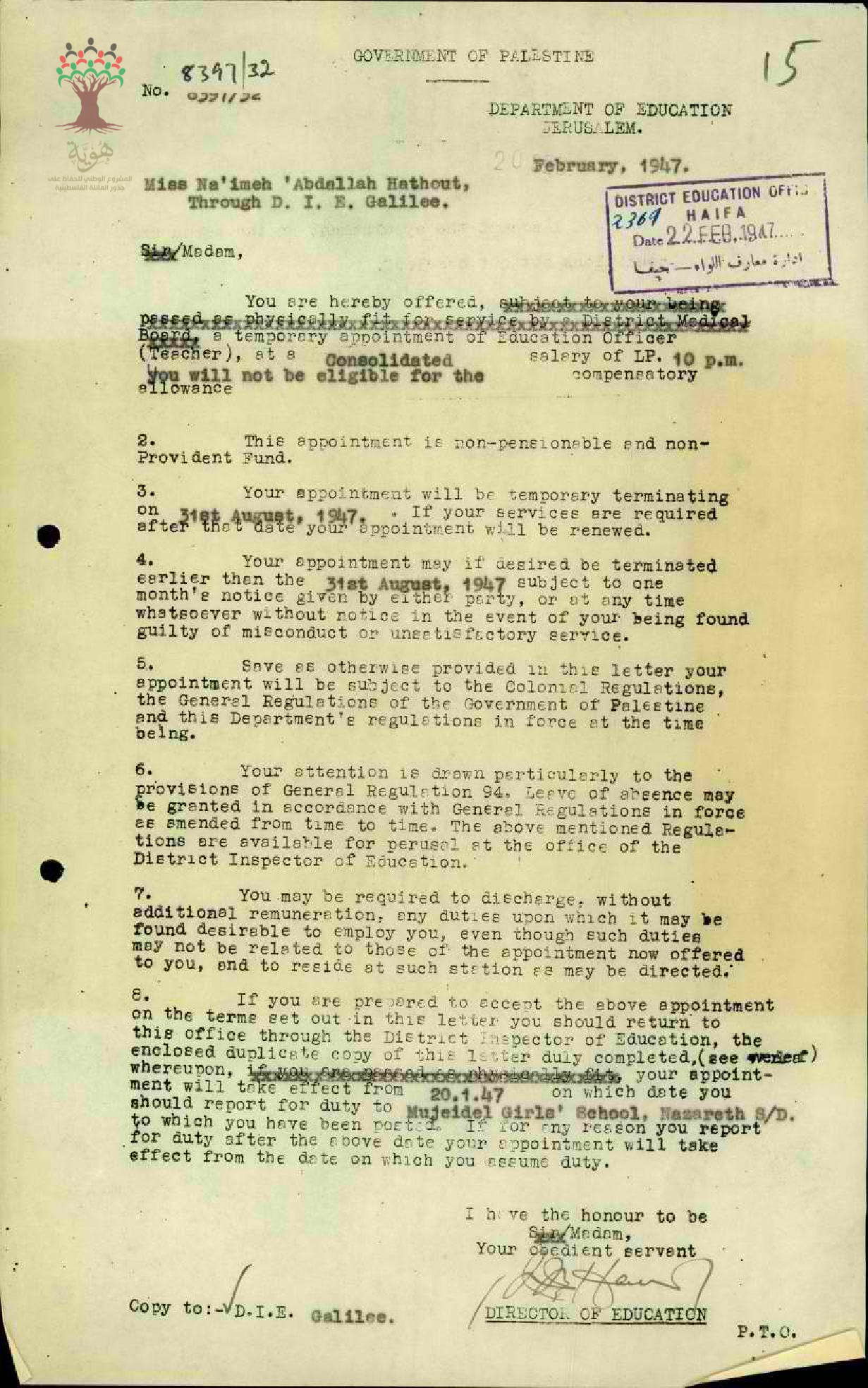 شروط تعيين المعلمة نعيمة حتحوت في مدرسة بنات المجيدل