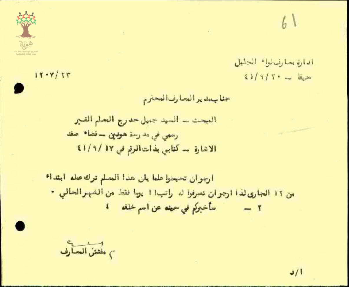 رساله من مفتش معارف الى ادارة معارف الجليل بخصوص المعلم جميل حدرج بانه قد ترك عمله