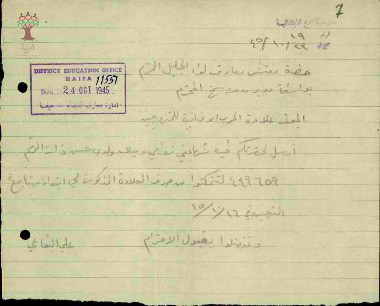 رسالة من المعلم علي البقاعي الى مفتش المعارف يطلب علاوة الحرب الاضافية للمتزوجين