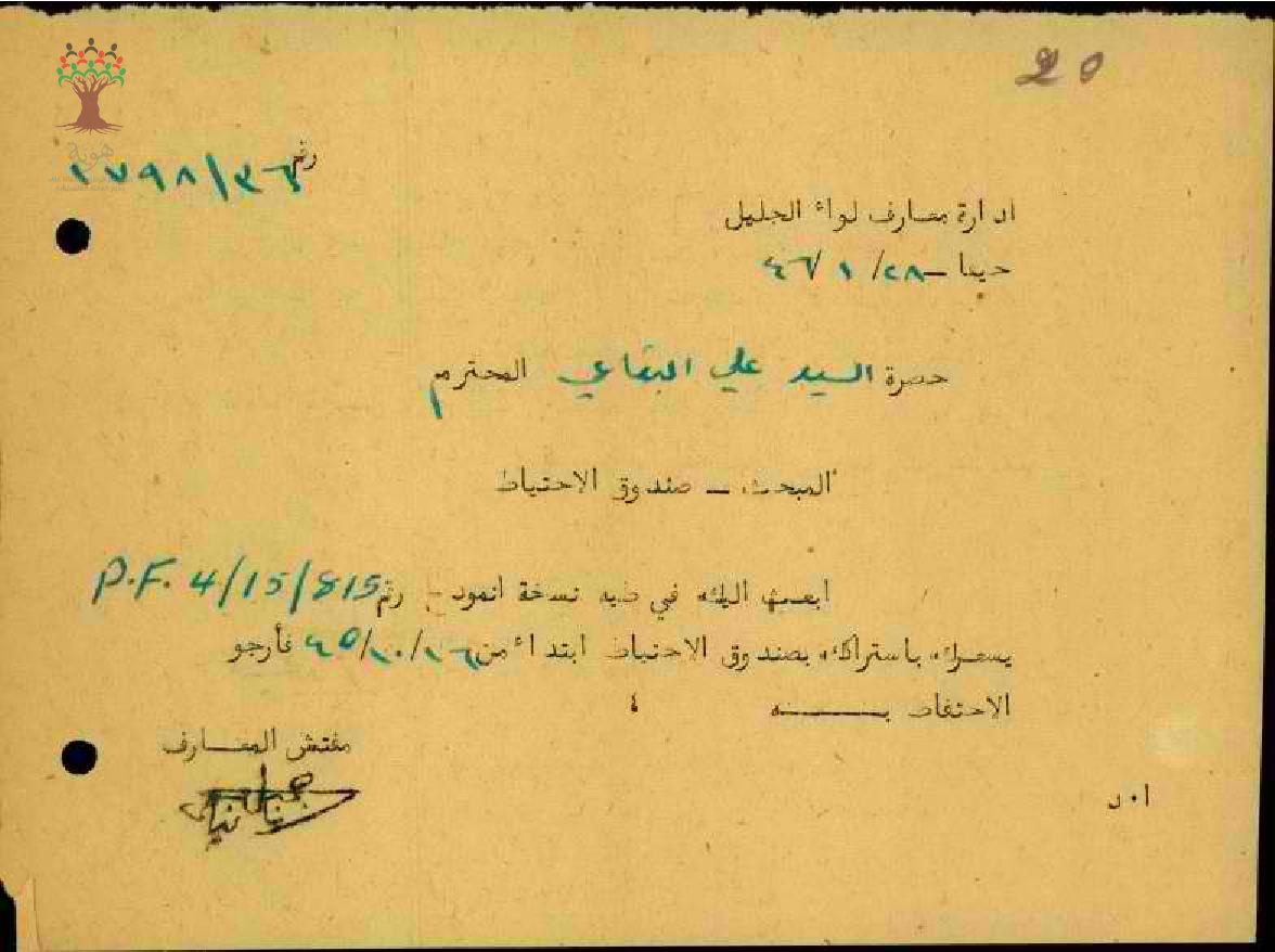 رسالة من مفتش المعارف الى المعلم علي البقاعي بخصوص اشتراكه في صندوق الاحتياط